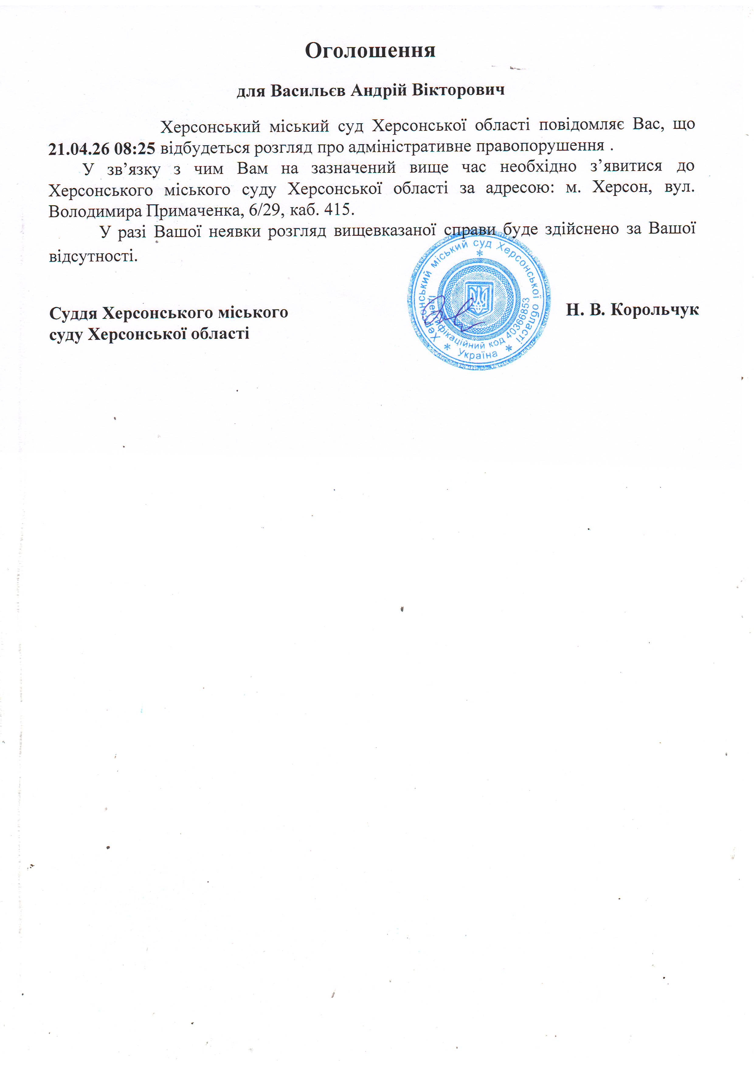 ОГОЛОШЕННЯ ПРО ВИКЛИК ДО СУДУ