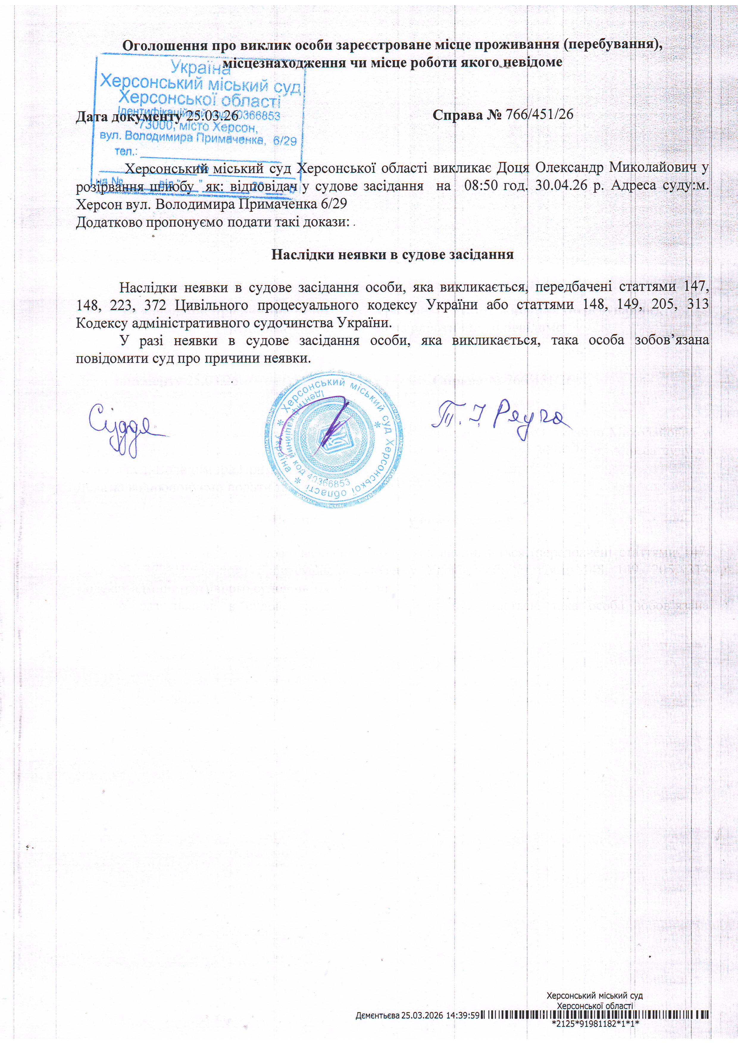 ОГОЛОШЕННЯ ПРО ВИКЛИК ДО СУДУ