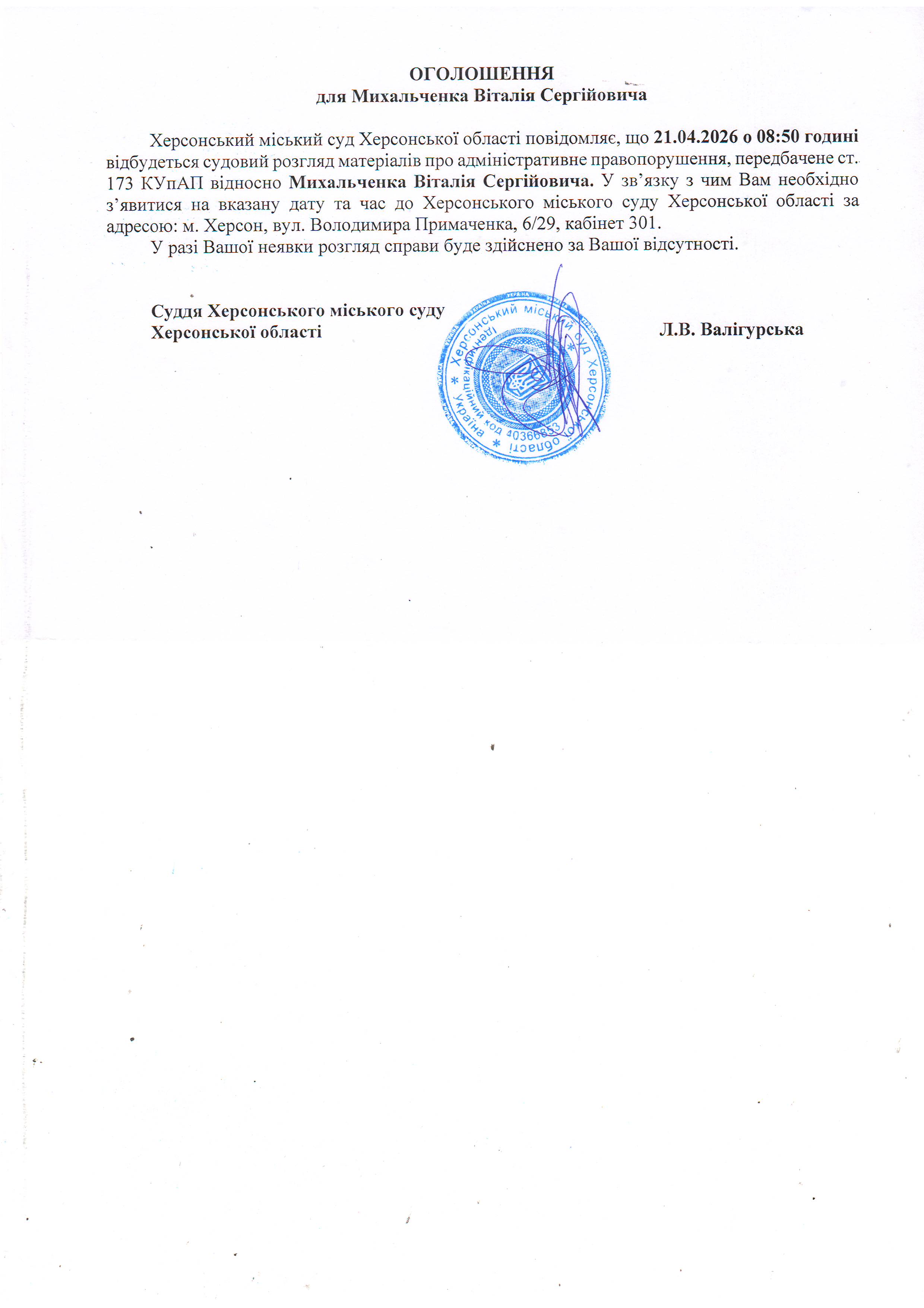 ОГОЛОШЕННЯ ПРО ВИКЛИК ДО СУДУ