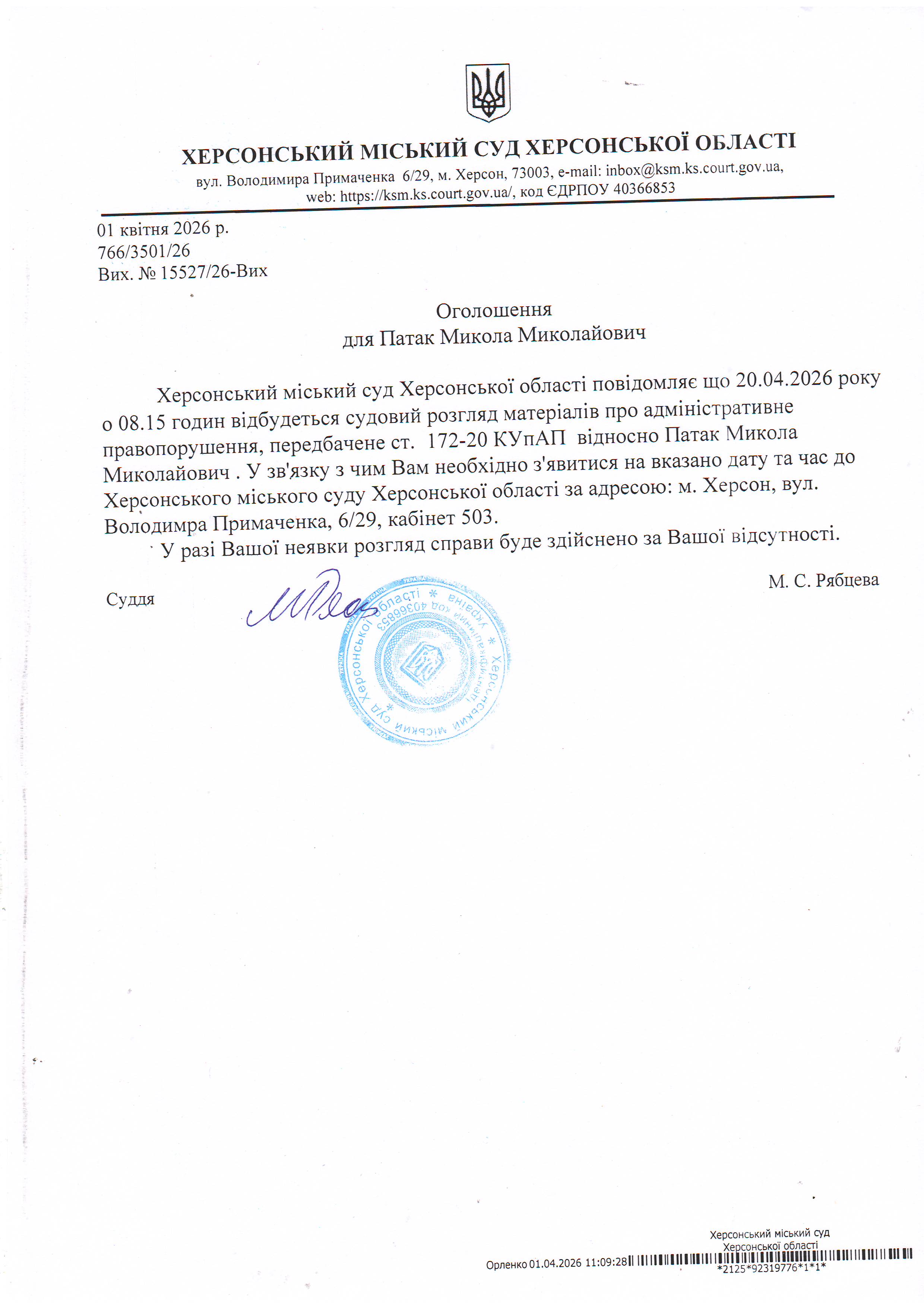 ОГОЛОШЕННЯ ПРО ВИКЛИК ДО СУДУ