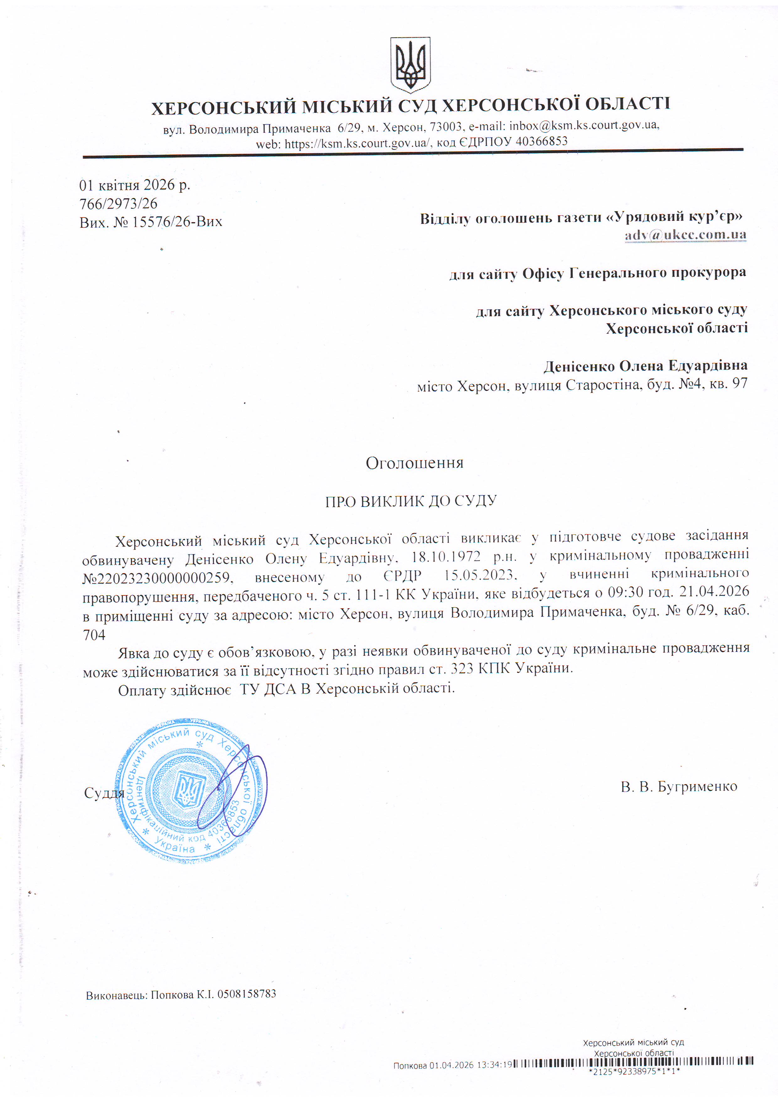 ОГОЛОШЕННЯ ПРО ВИКЛИК ДО СУДУ