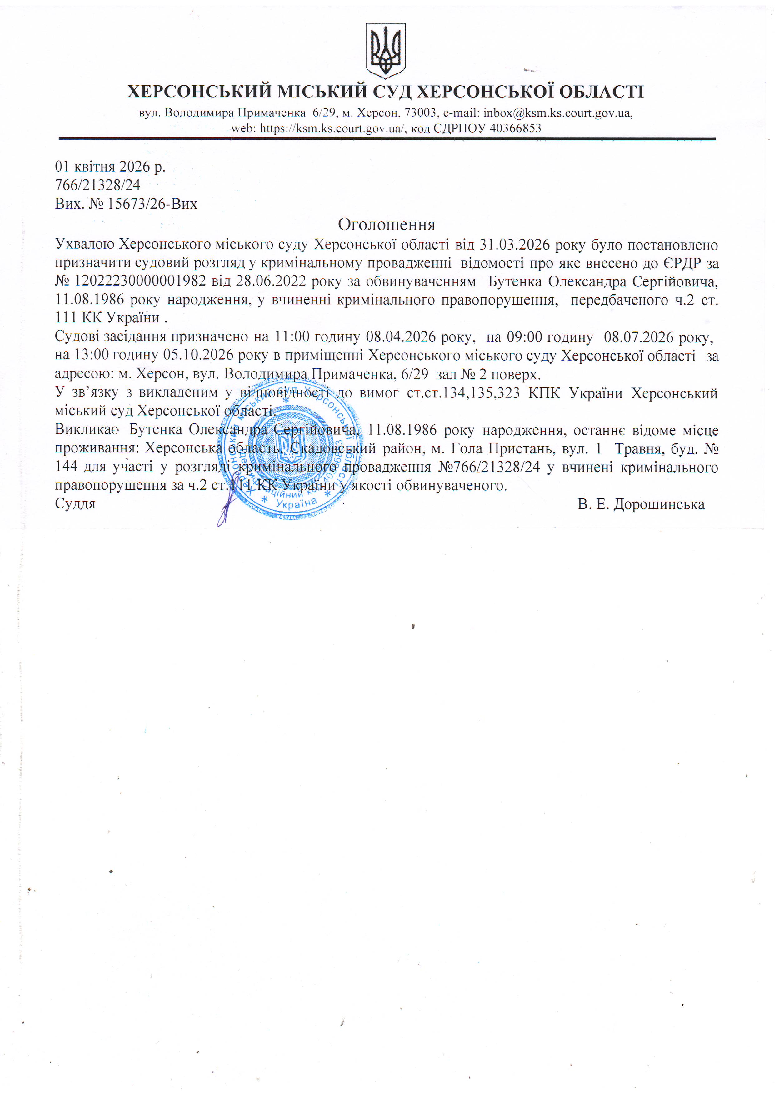 ОГОЛОШЕННЯ ПРО ВИКЛИК ДО СУДУ