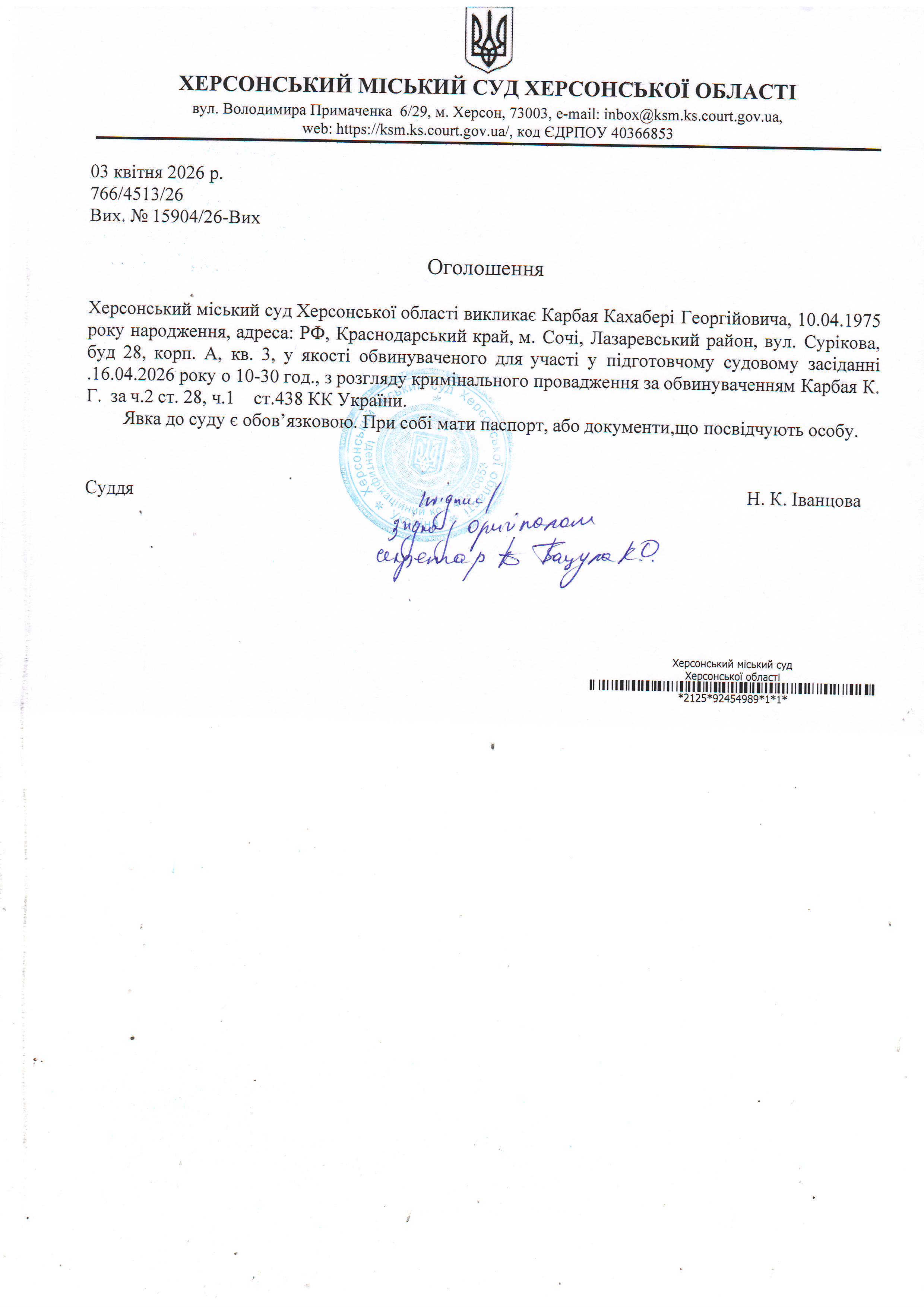 ОГОЛОШЕННЯ ПРО ВИКЛИК ДО СУДУ