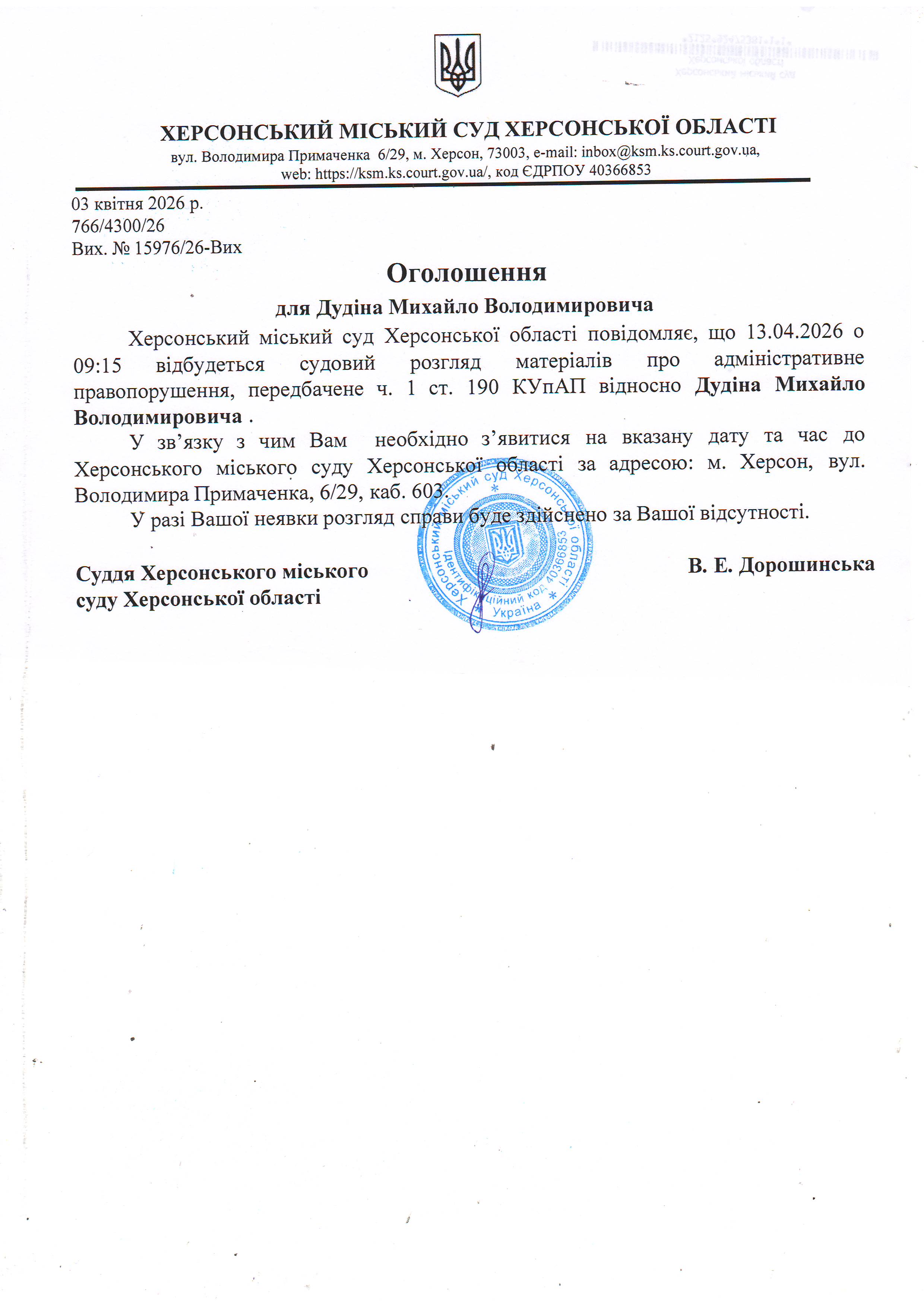 ОГОЛОШЕННЯ ПРО ВИКЛИК ДО СУДУ