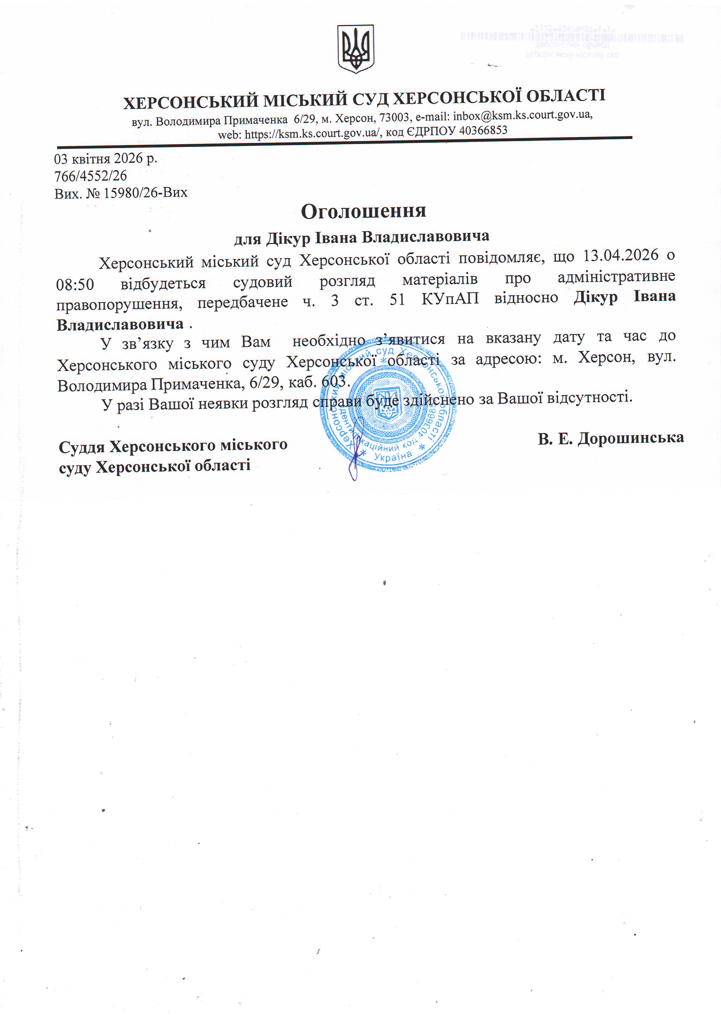 ОГОЛОШЕННЯ ПРО ВИКЛИК ДО СУДУ