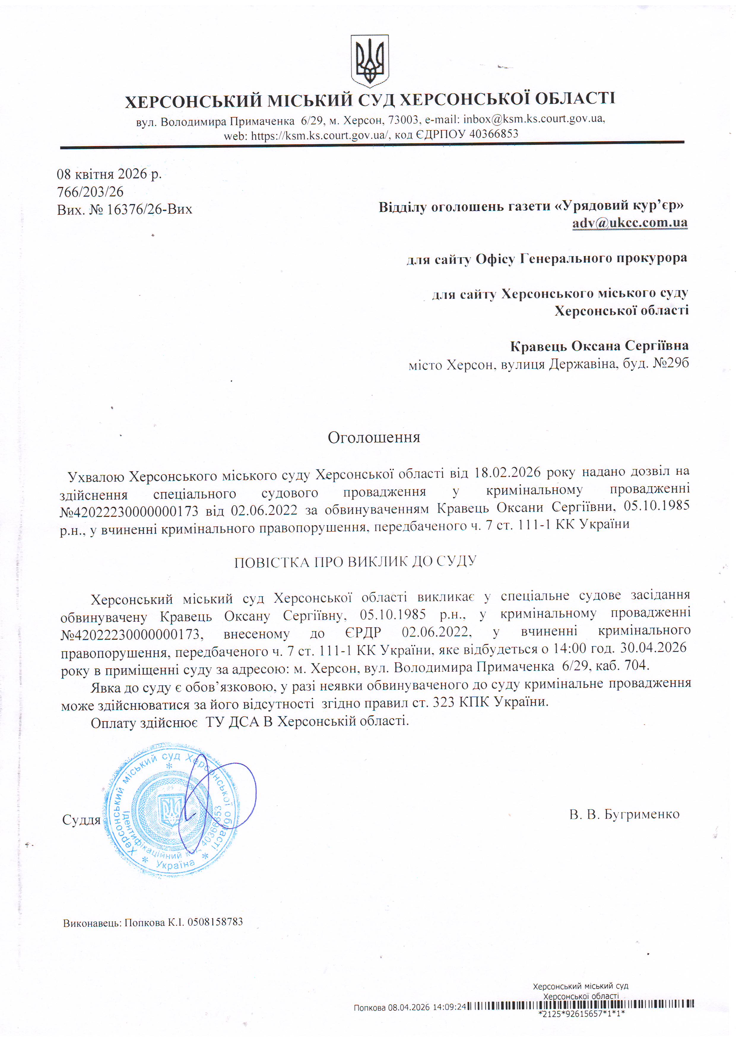Оголошення про виклик особи в суд та повідомлення про судове рішення