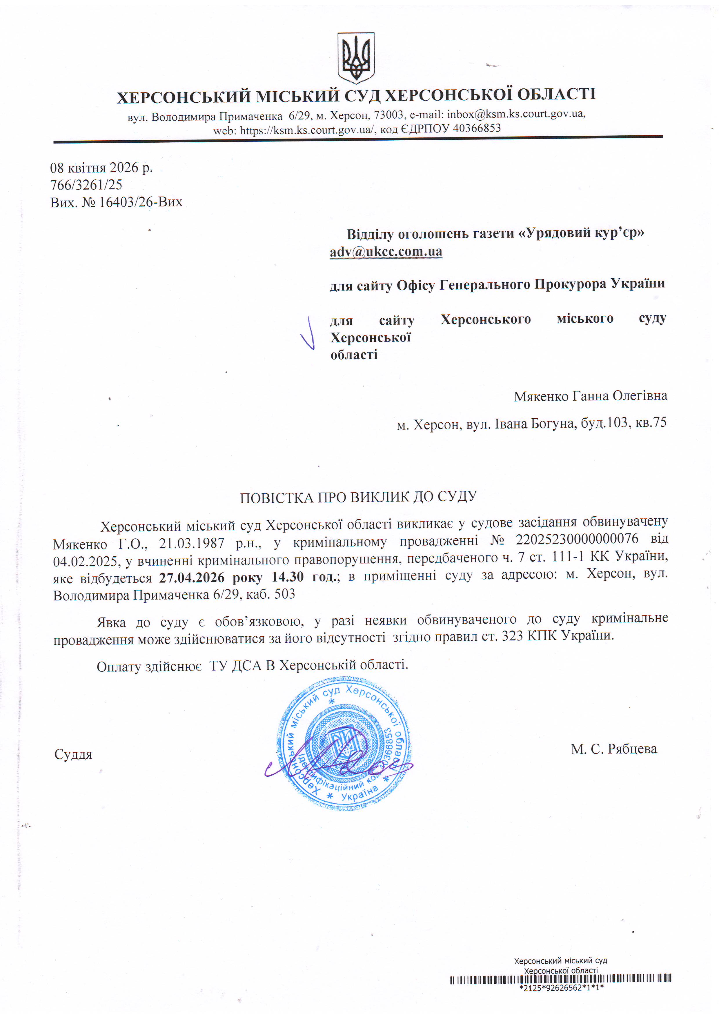 ОГОЛОШЕННЯ ПРО ВИКЛИК ДО СУДУ