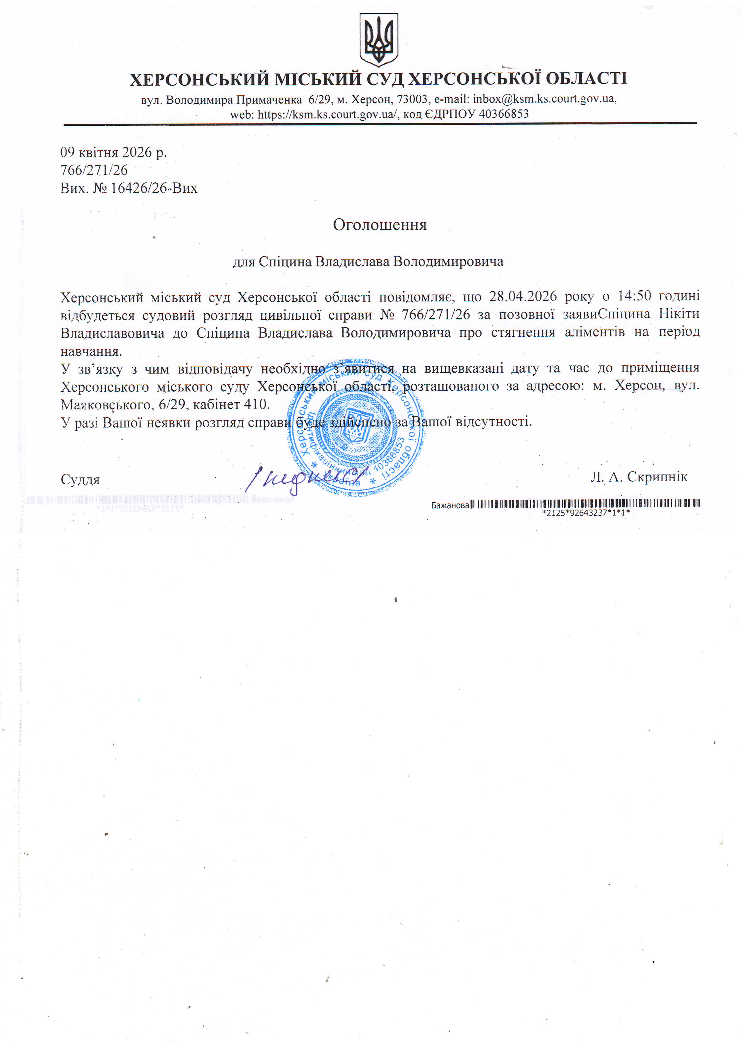 Оголошення про виклик особи в суд та повідомлення про судове рішення