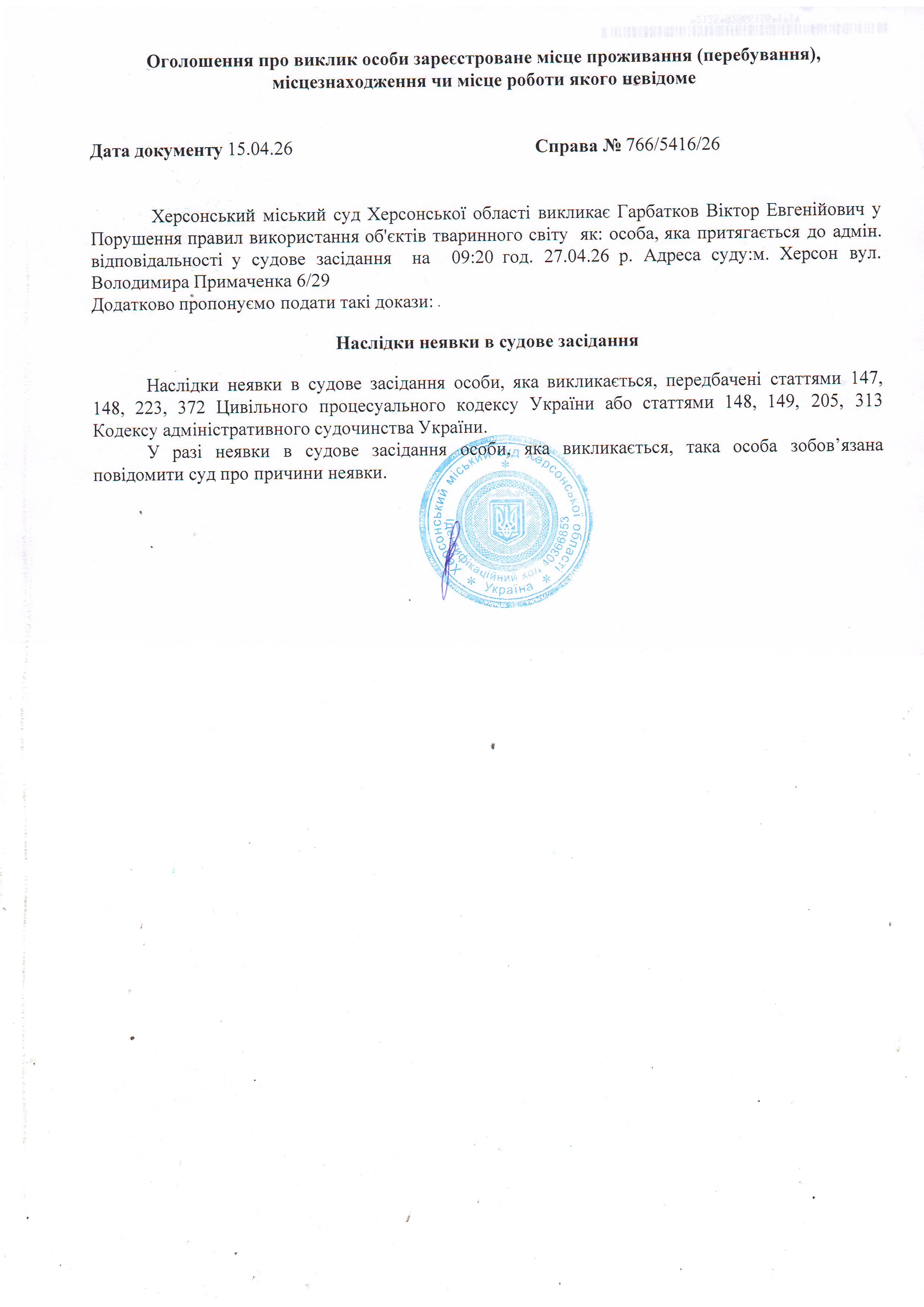 ОГОЛОШЕННЯ ПРО ВИКЛИК ДО СУДУ