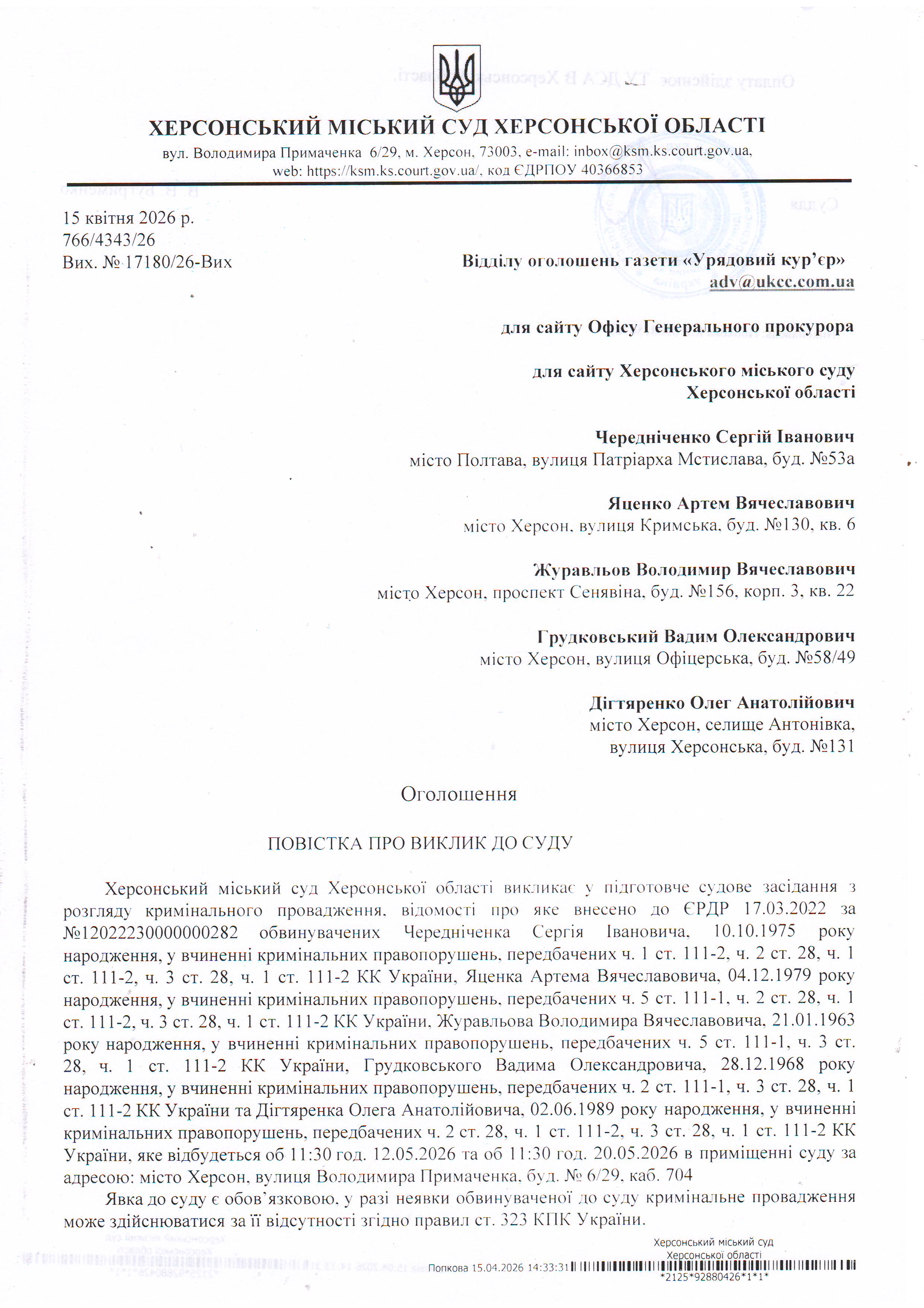 Оголошення для Чередніченка Сергія Івановича, Яценка Артема Вячеславовича, Журавльова Володимира Вячеславовича, Грудковського Вадима Олександровича, Дігтяренка Олега Анатолійовича
