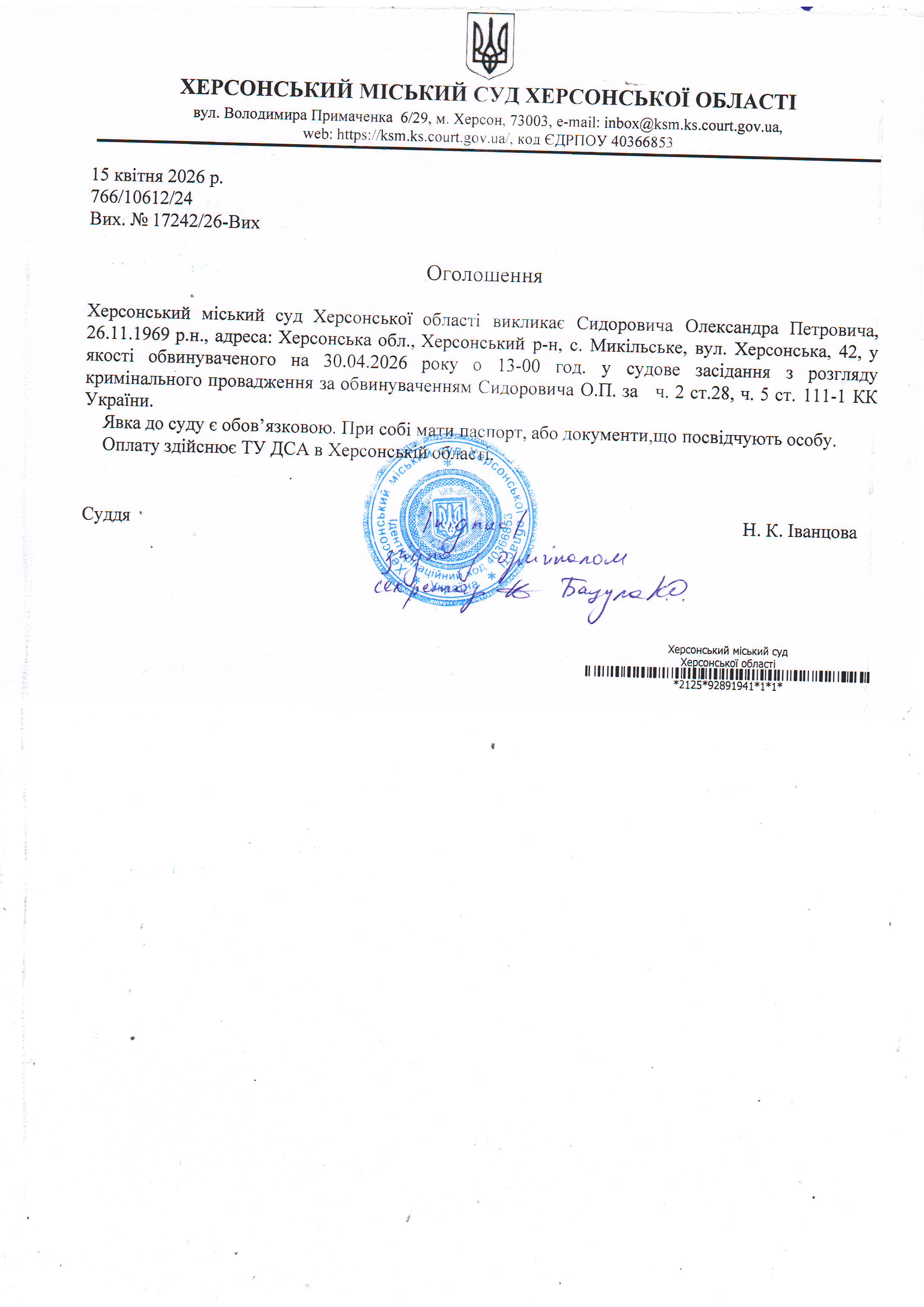 ОГОЛОШЕННЯ ПРО ВИКЛИК ДО СУДУ
