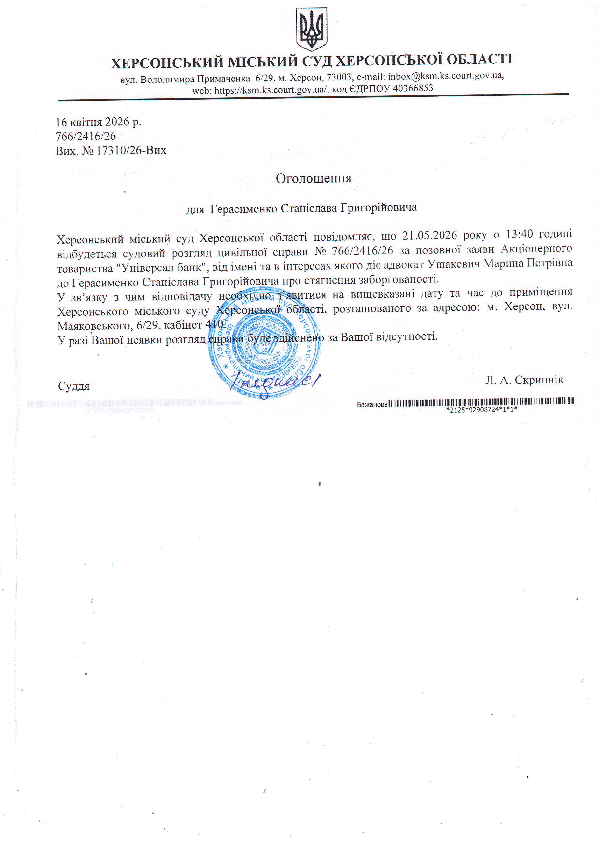 ОГОЛОШЕННЯ ПРО ВИКЛИК ДО СУДУ