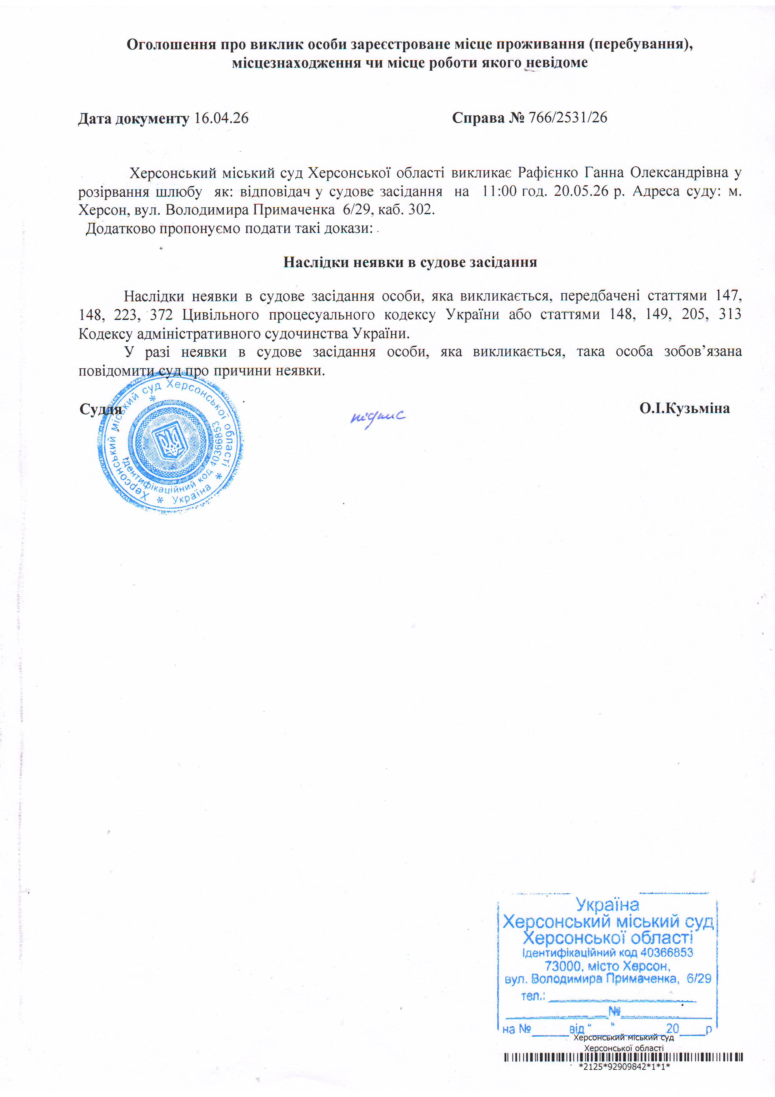 ОГОЛОШЕННЯ ПРО ВИКЛИК ДО СУДУ