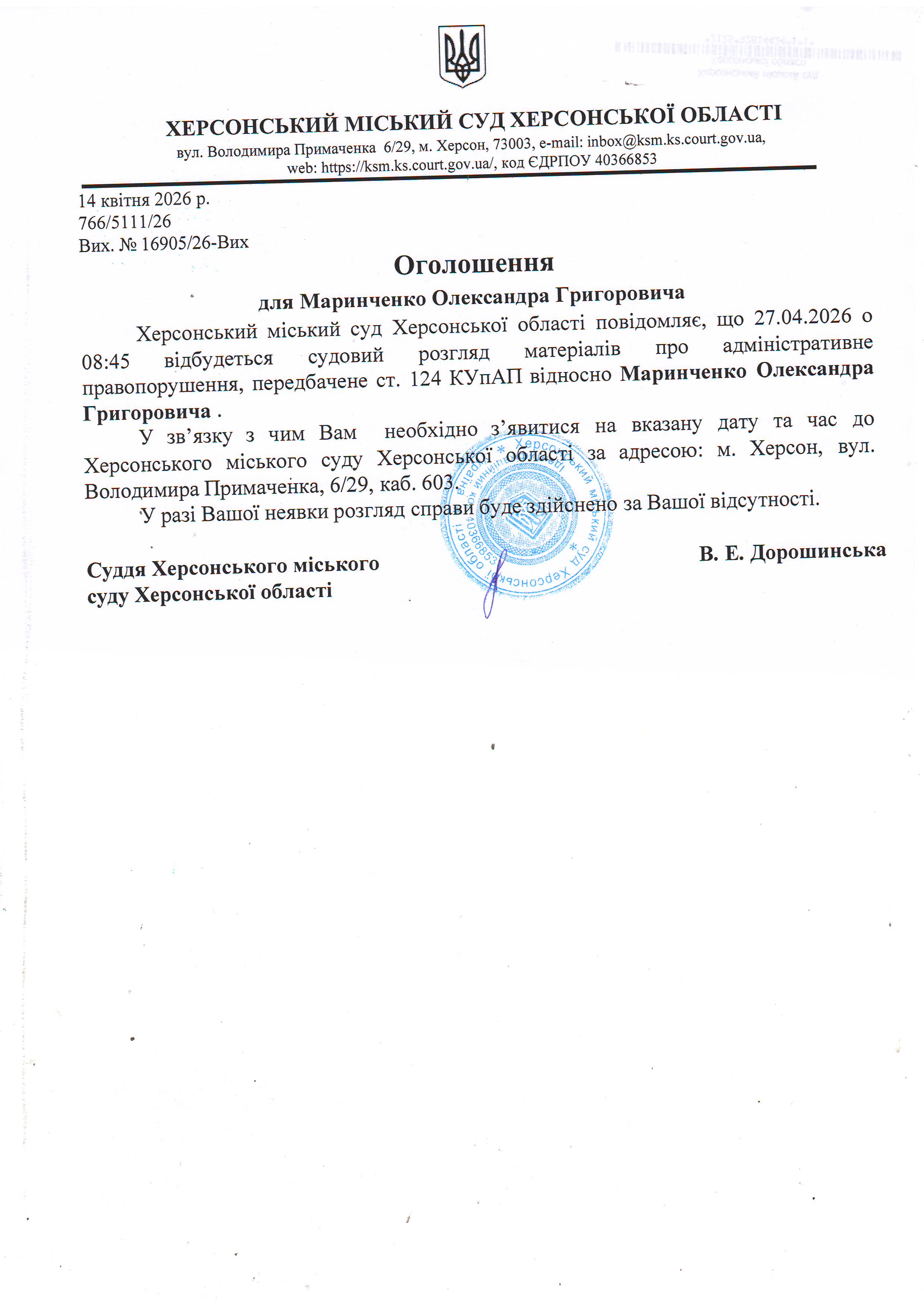 ОГОЛОШЕННЯ ПРО ВИКЛИК ДО СУДУ