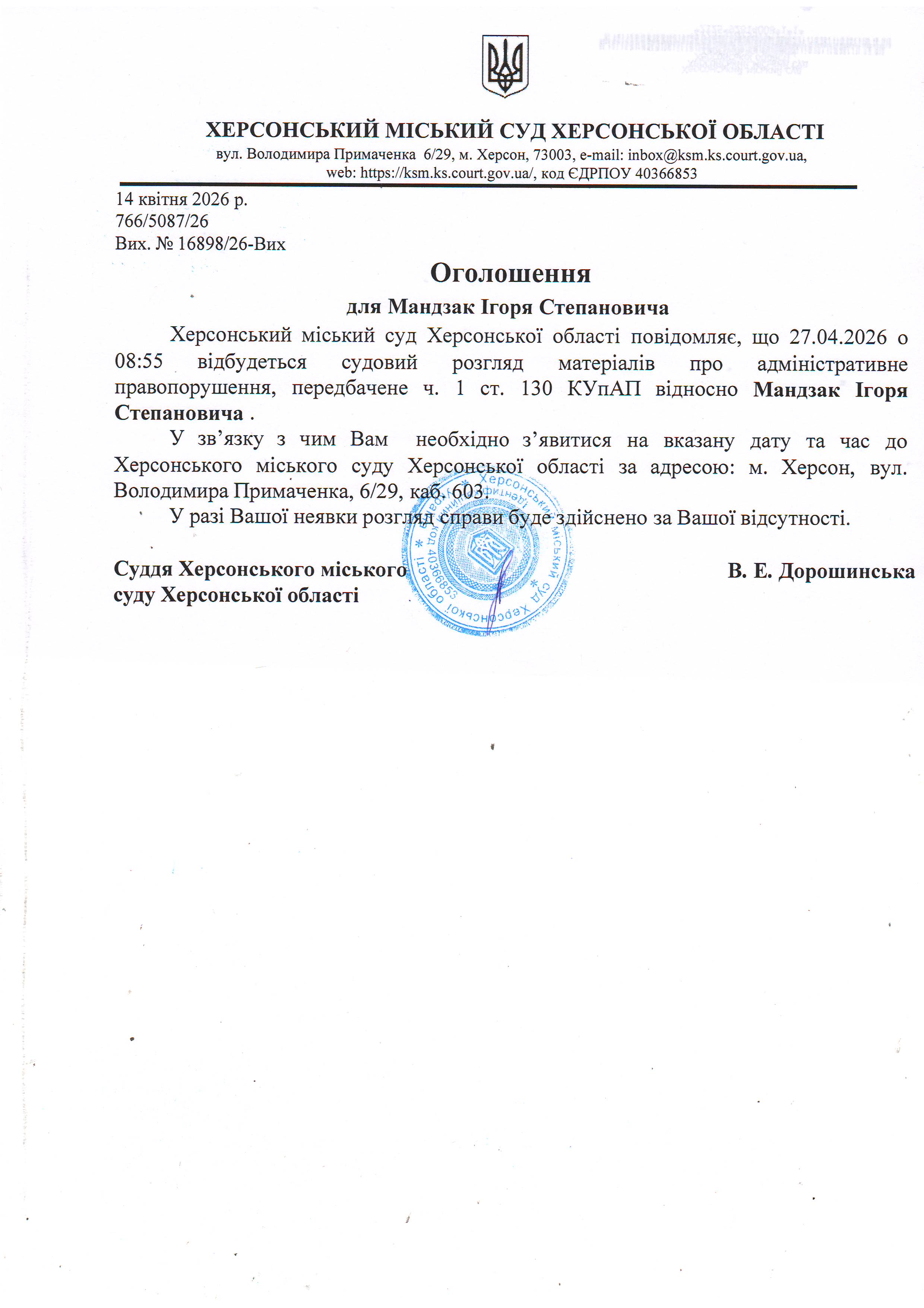 ОГОЛОШЕННЯ ПРО ВИКЛИК ДО СУДУ
