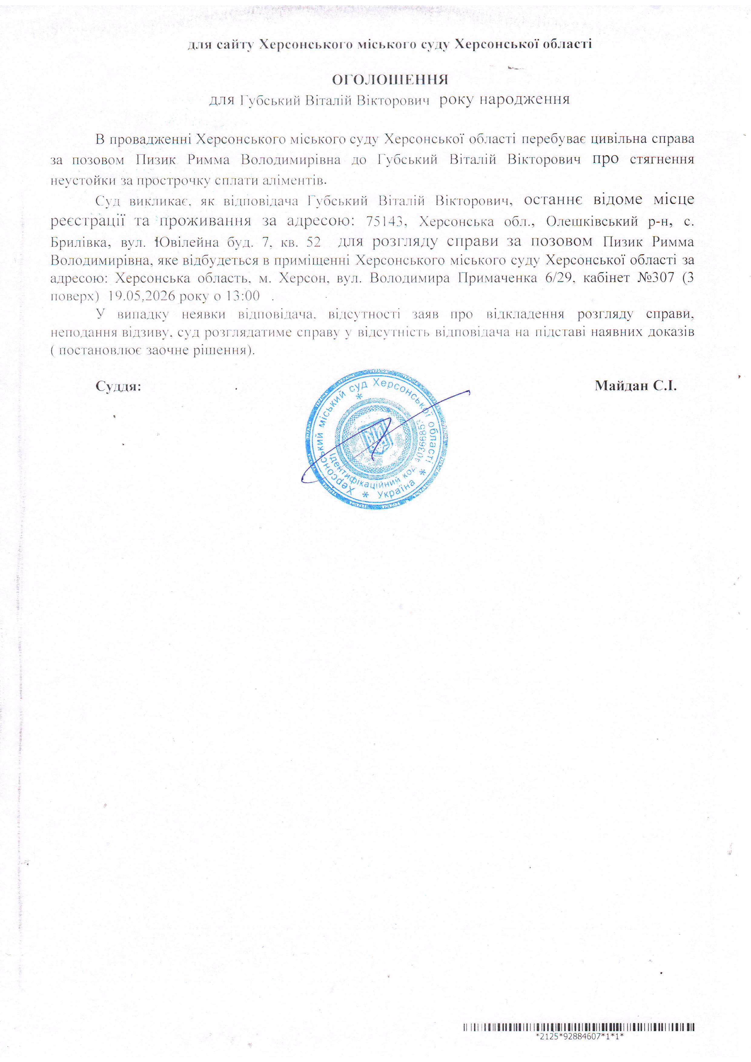 Оголошення для Губського Віталія Вікторовича