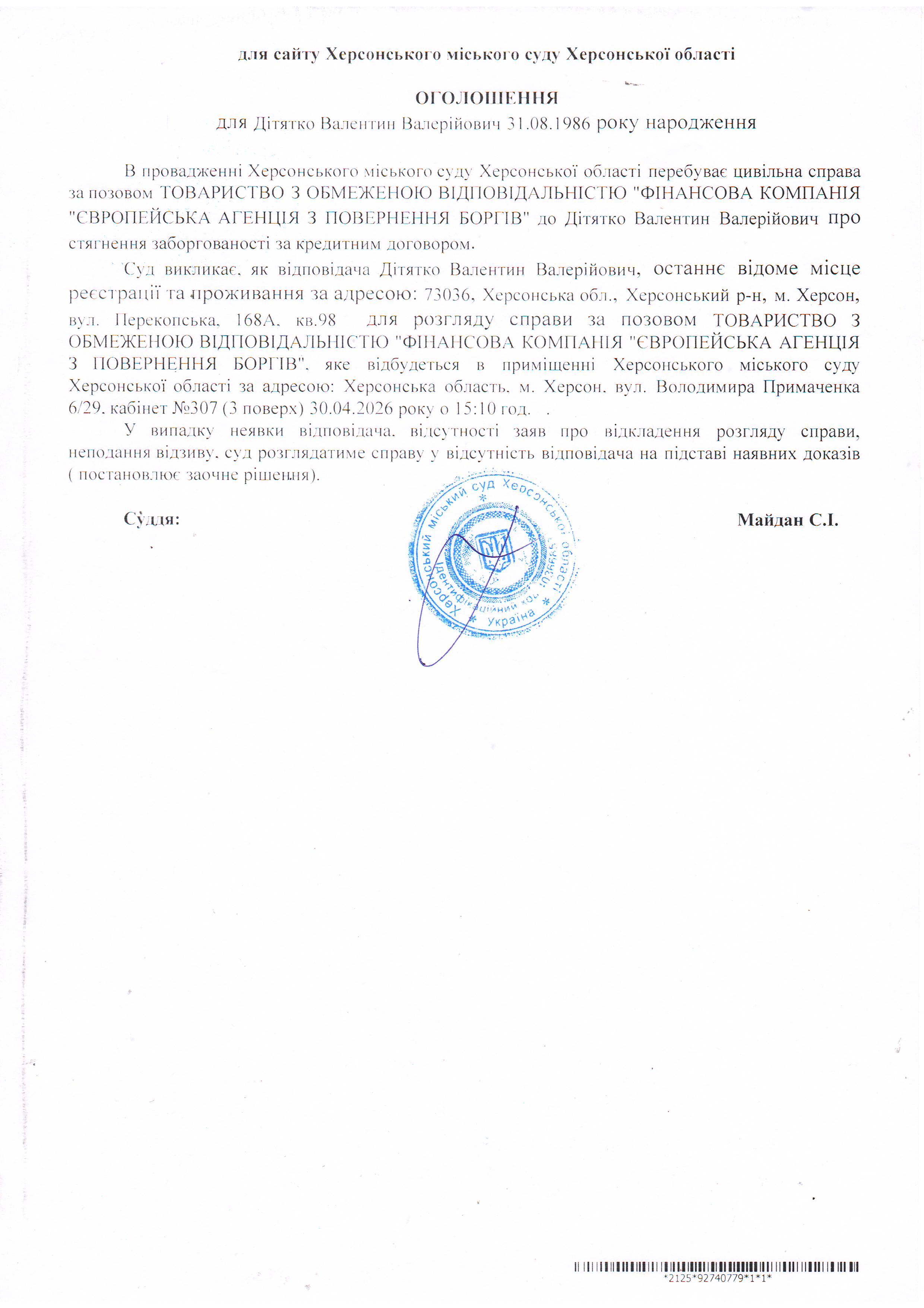 ОГОЛОШЕННЯ ПРО ВИКЛИК ДО СУДУ