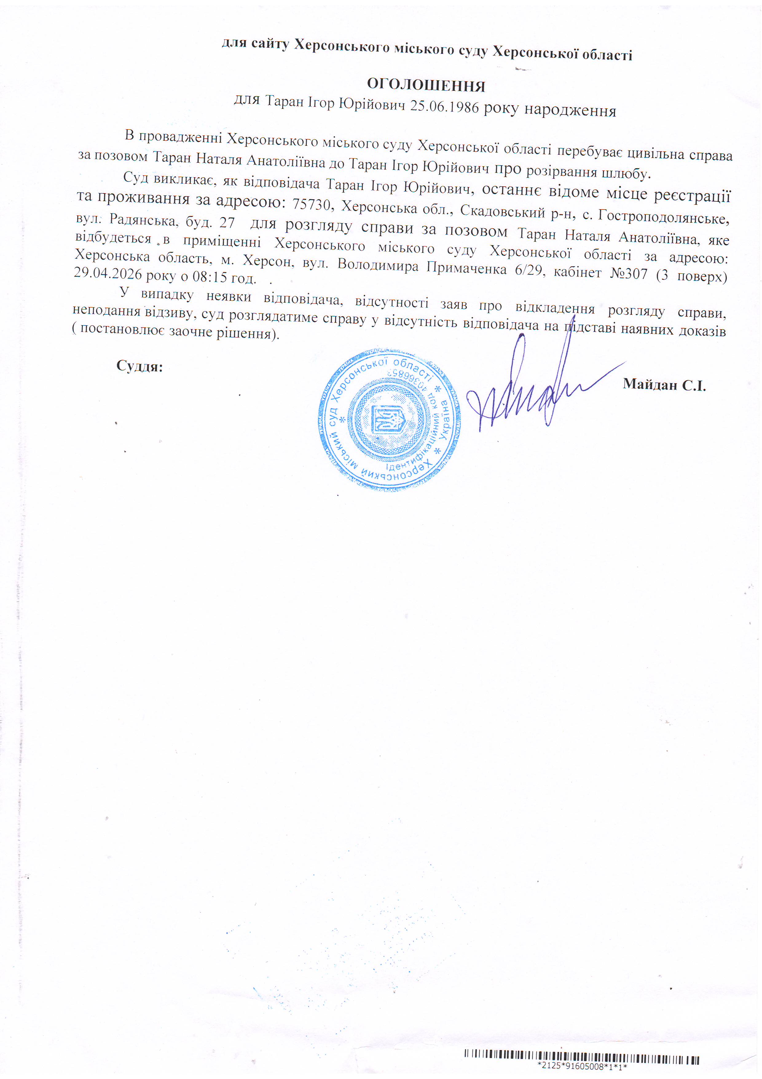 ОГОЛОШЕННЯ ПРО ВИКЛИК ДО СУДУ