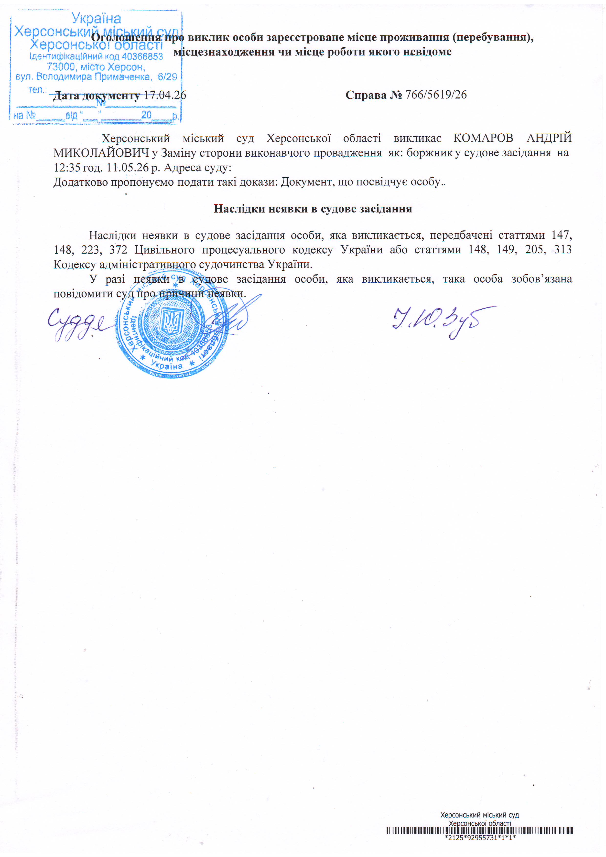 ОГОЛОШЕННЯ ПРО ВИКЛИК ДО СУДУ