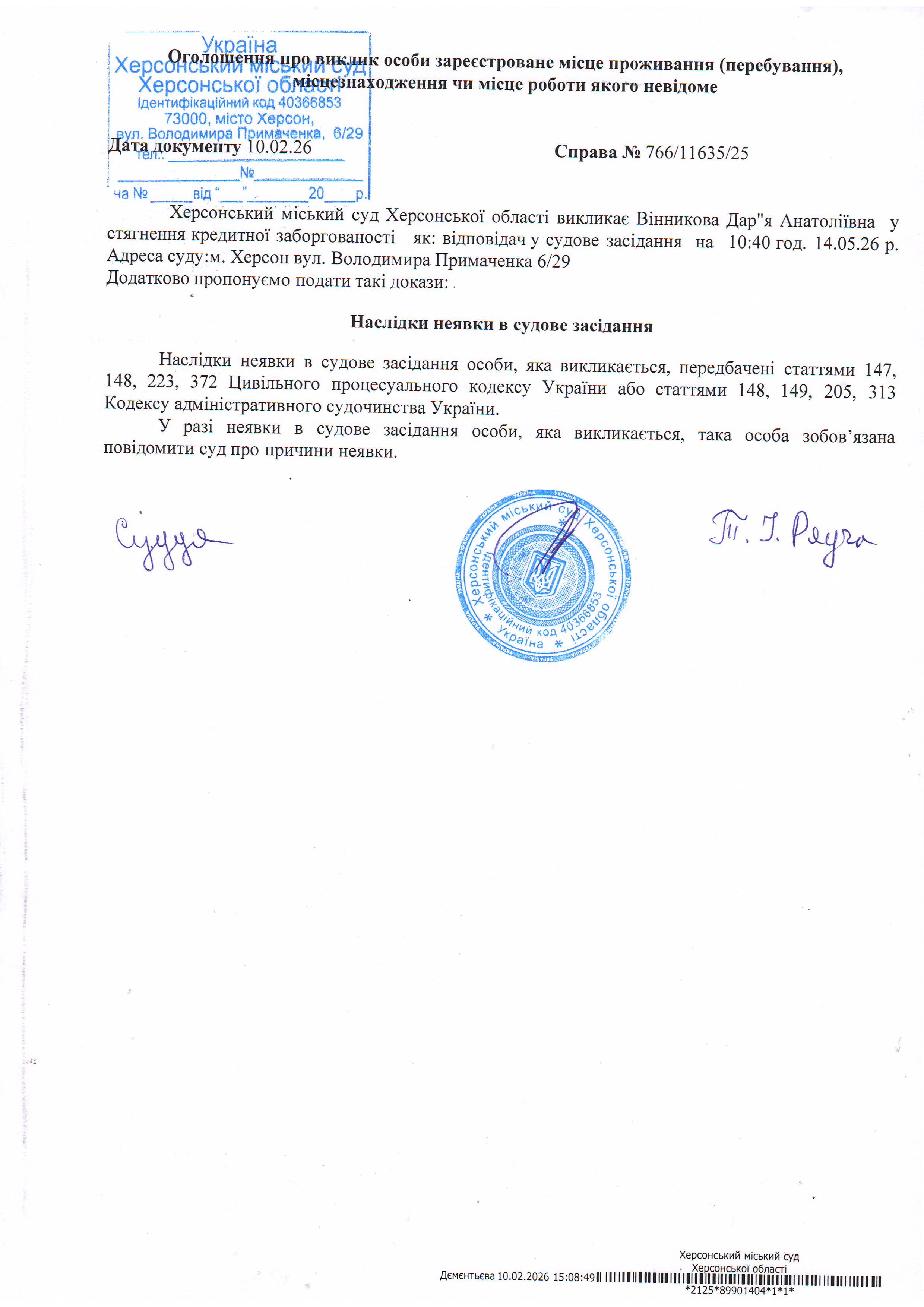 ОГОЛОШЕННЯ ПРО ВИКЛИК ДО СУДУ