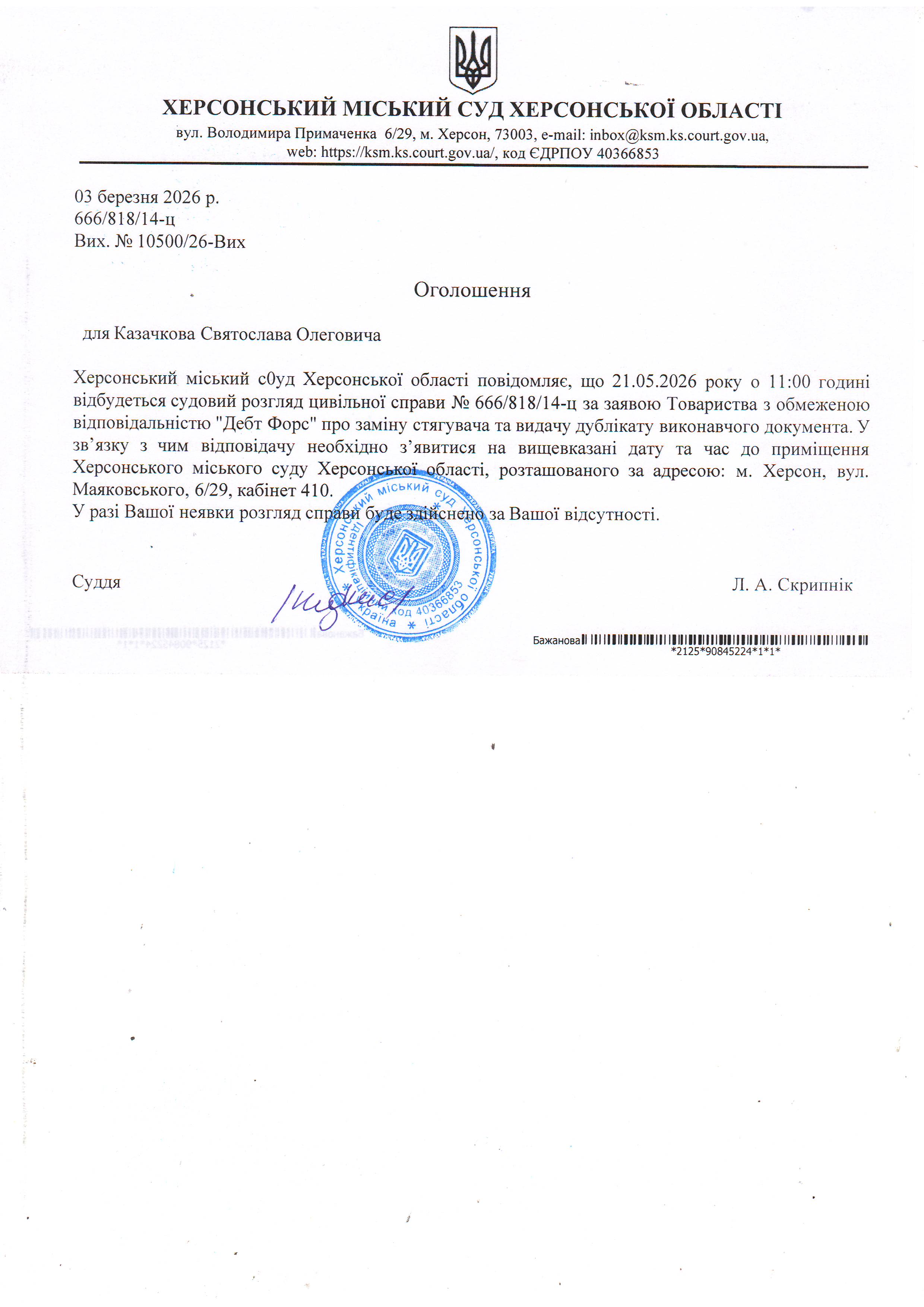 ОГОЛОШЕННЯ ПРО ВИКЛИК ДО СУДУ
