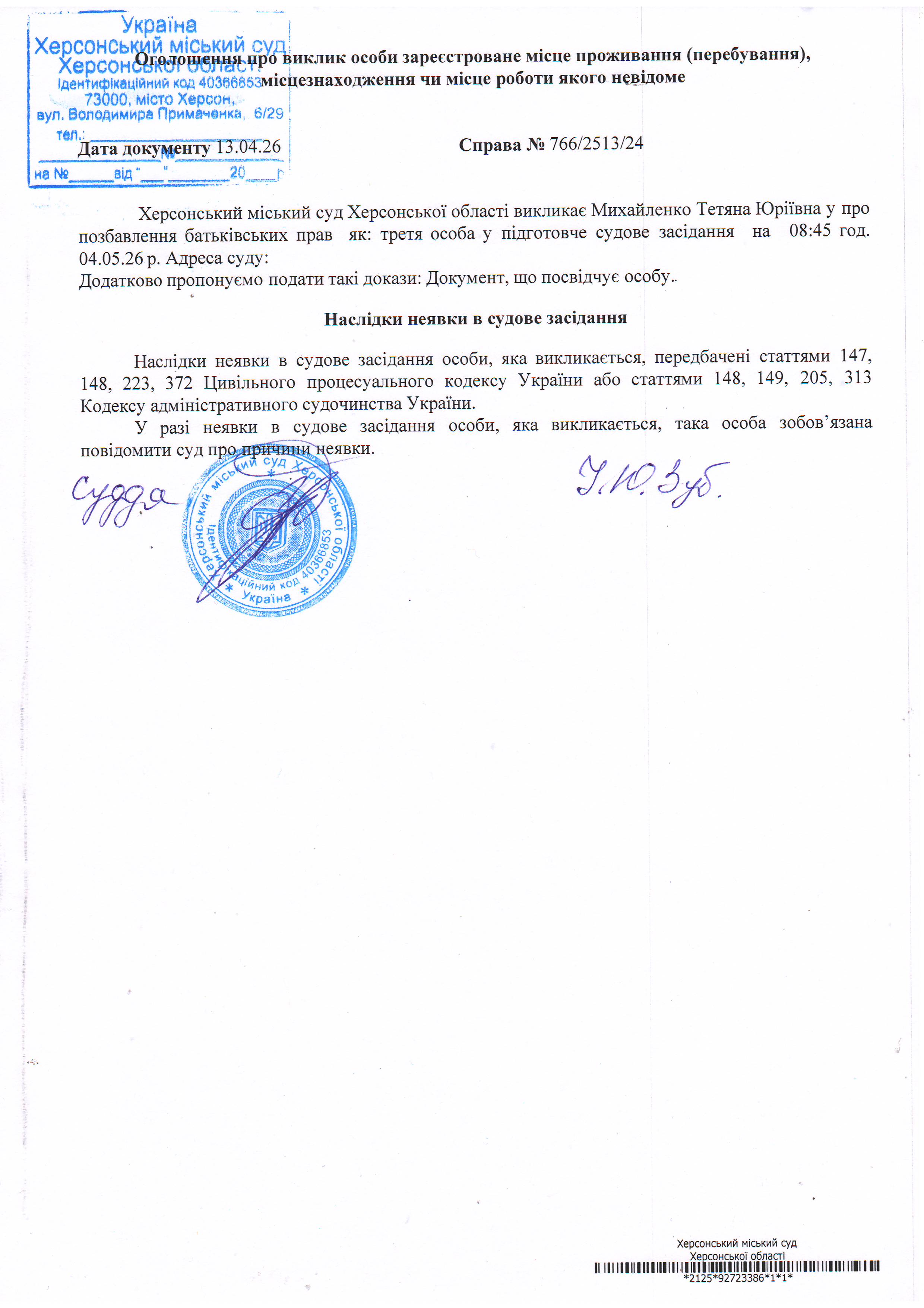 ОГОЛОШЕННЯ ПРО ВИКЛИК ДО СУДУ