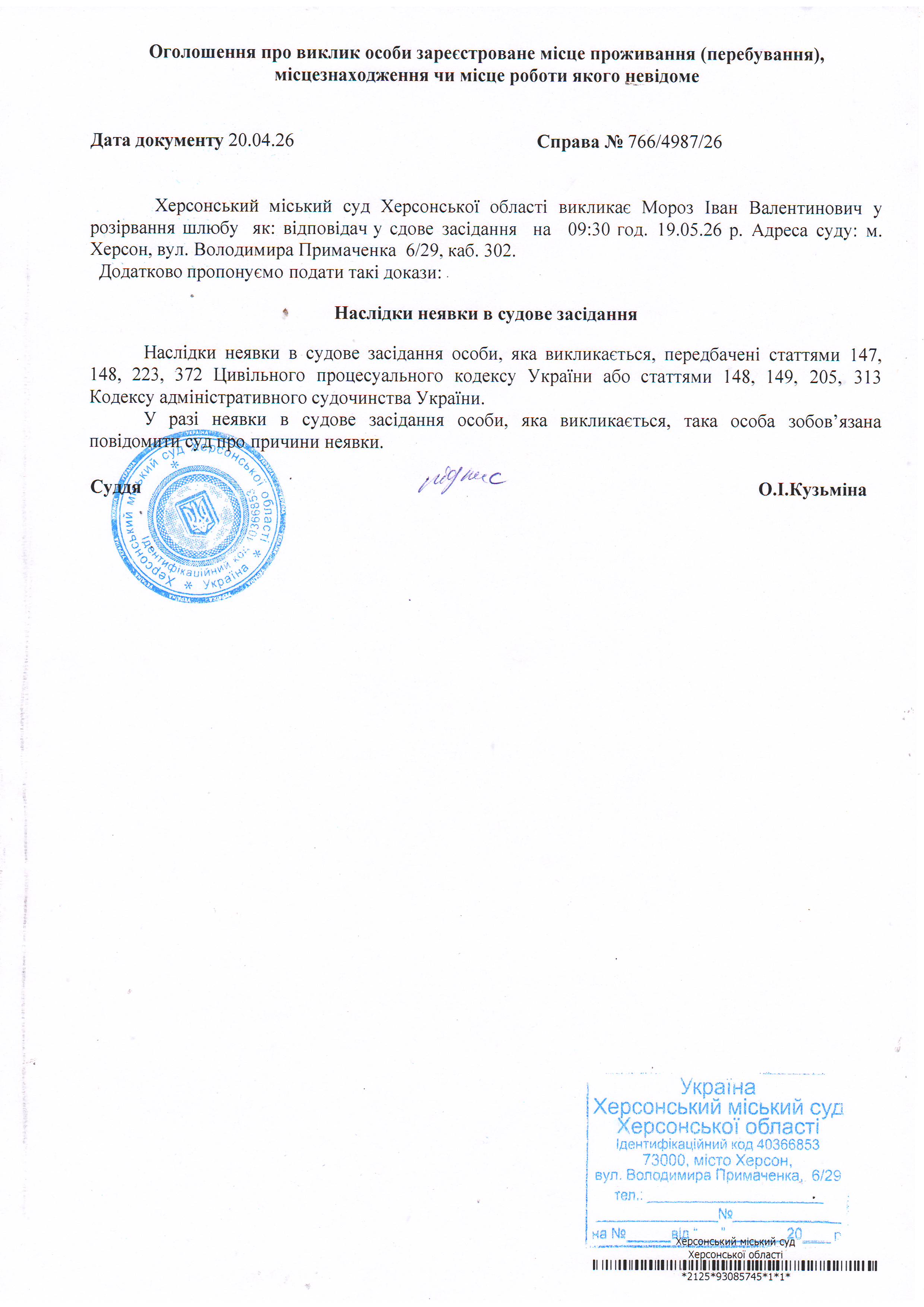 ОГОЛОШЕННЯ ПРО ВИКЛИК ДО СУДУ