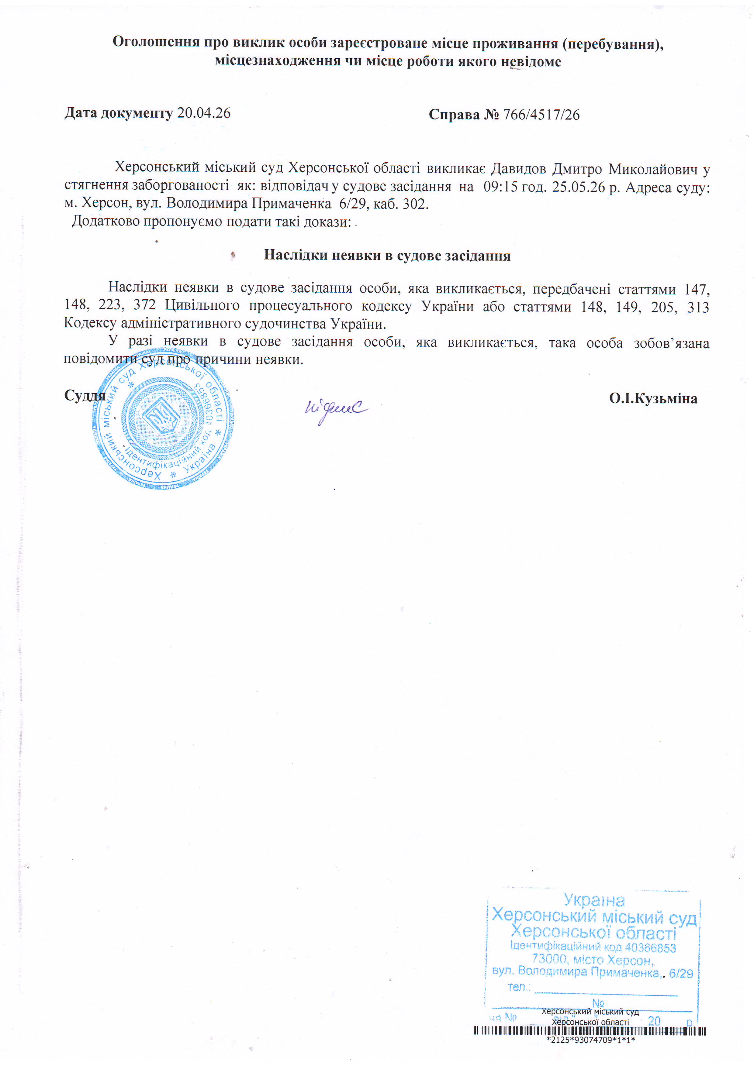 ОГОЛОШЕННЯ ПРО ВИКЛИК ДО СУДУ