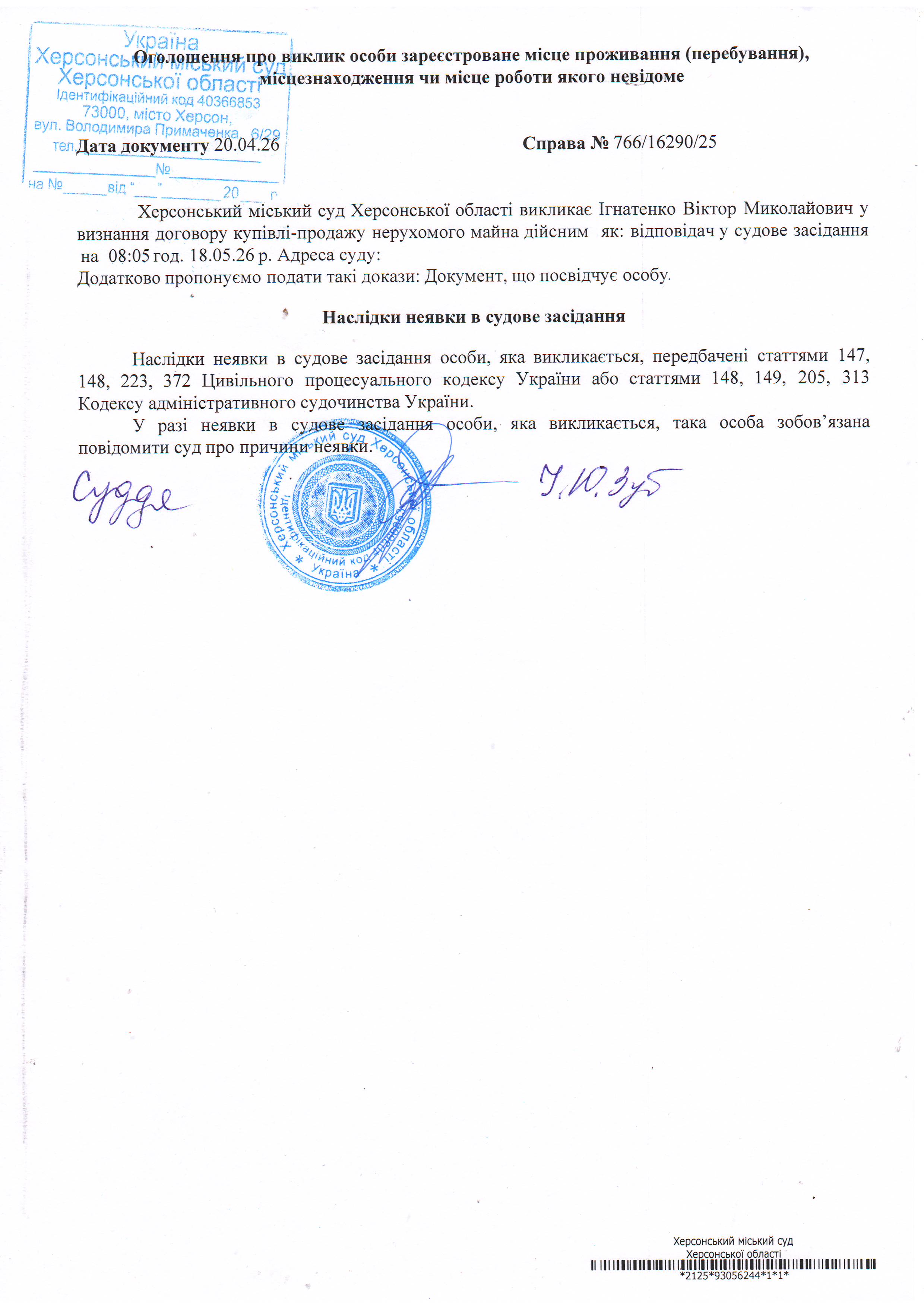ОГОЛОШЕННЯ ПРО ВИКЛИК ДО СУДУ
