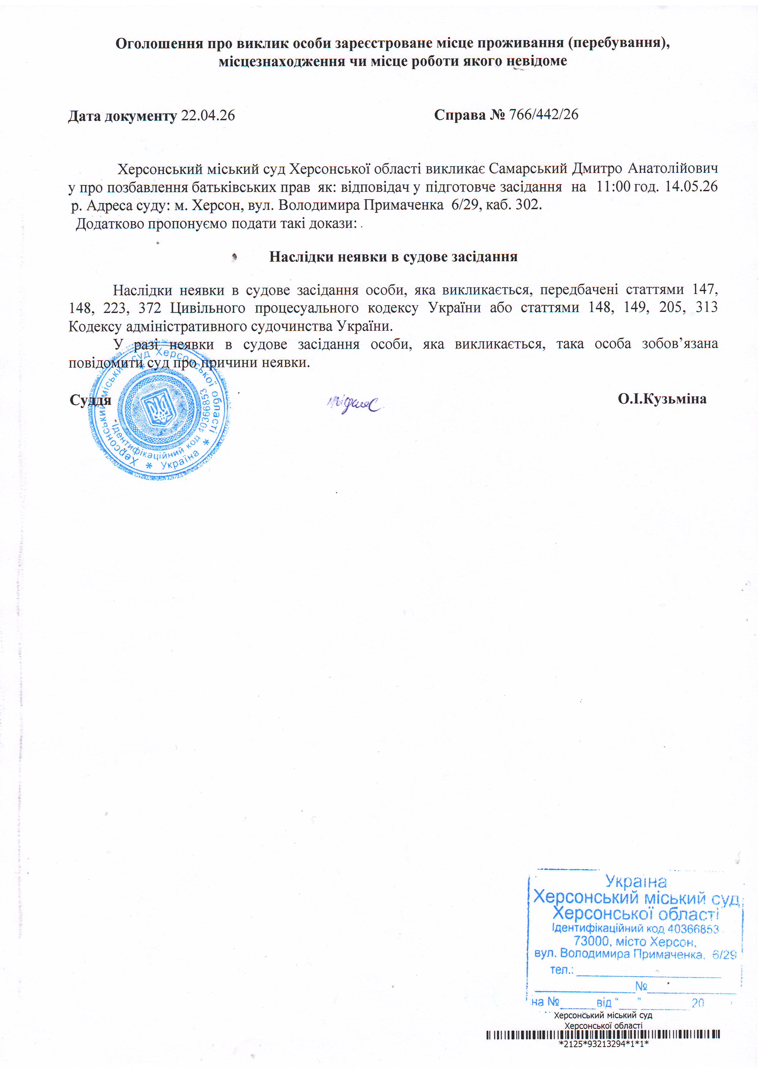 ОГОЛОШЕННЯ ПРО ВИКЛИК ДО СУДУ