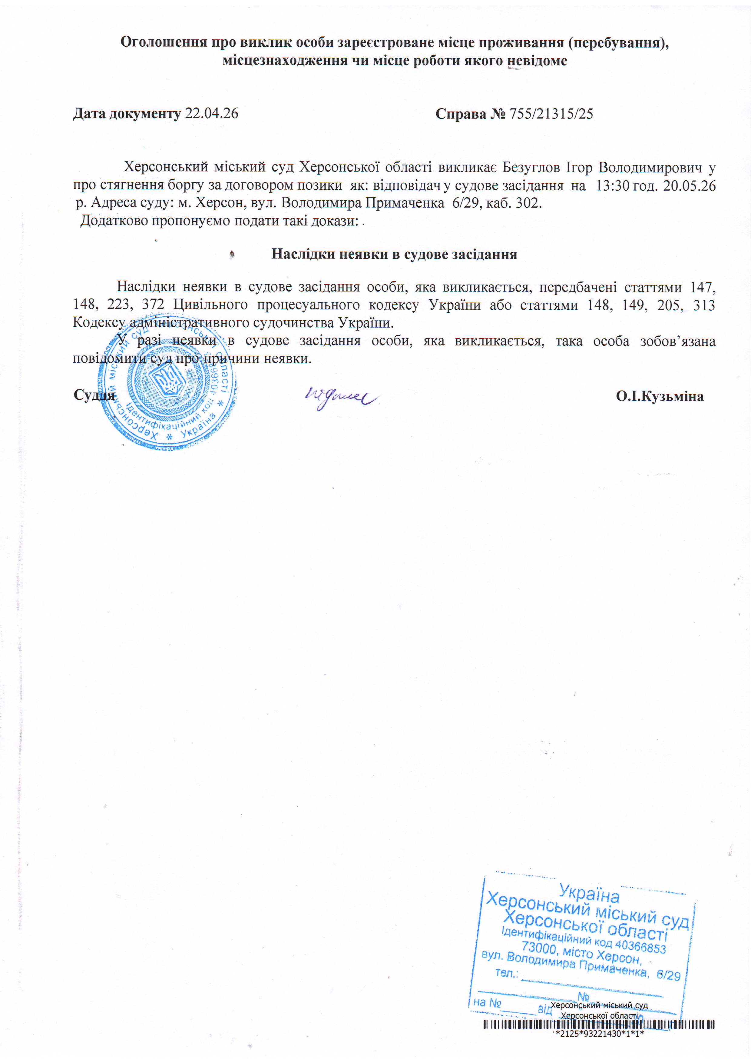 ОГОЛОШЕННЯ ПРО ВИКЛИК ДО СУДУ