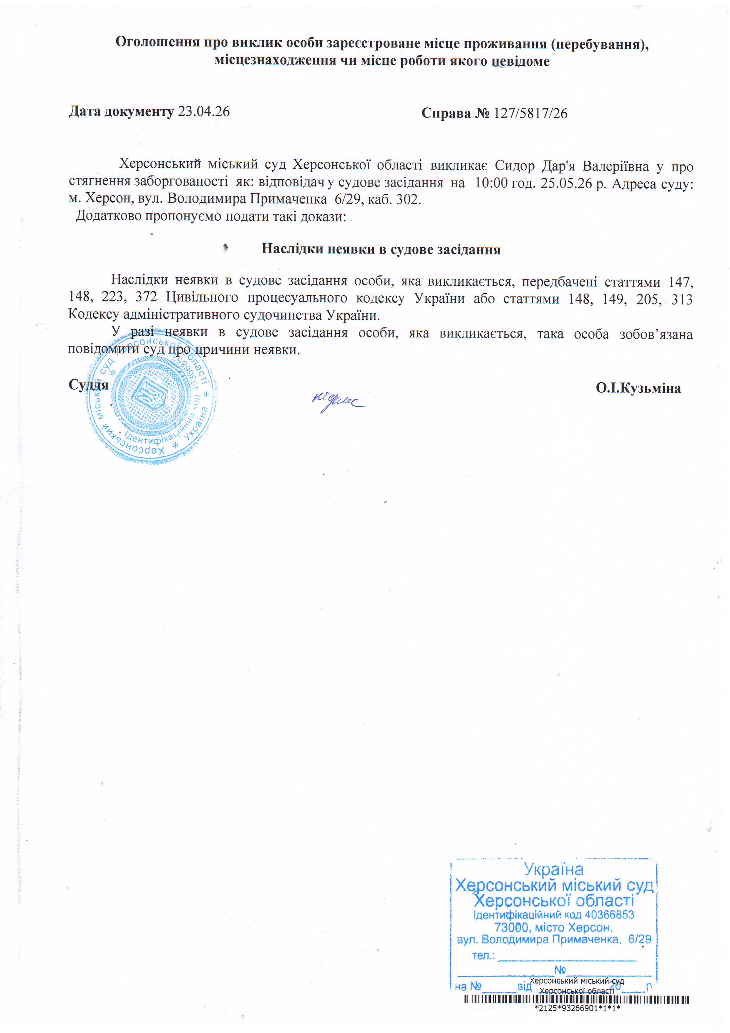 ОГОЛОШЕННЯ ПРО ВИКЛИК ДО СУДУ