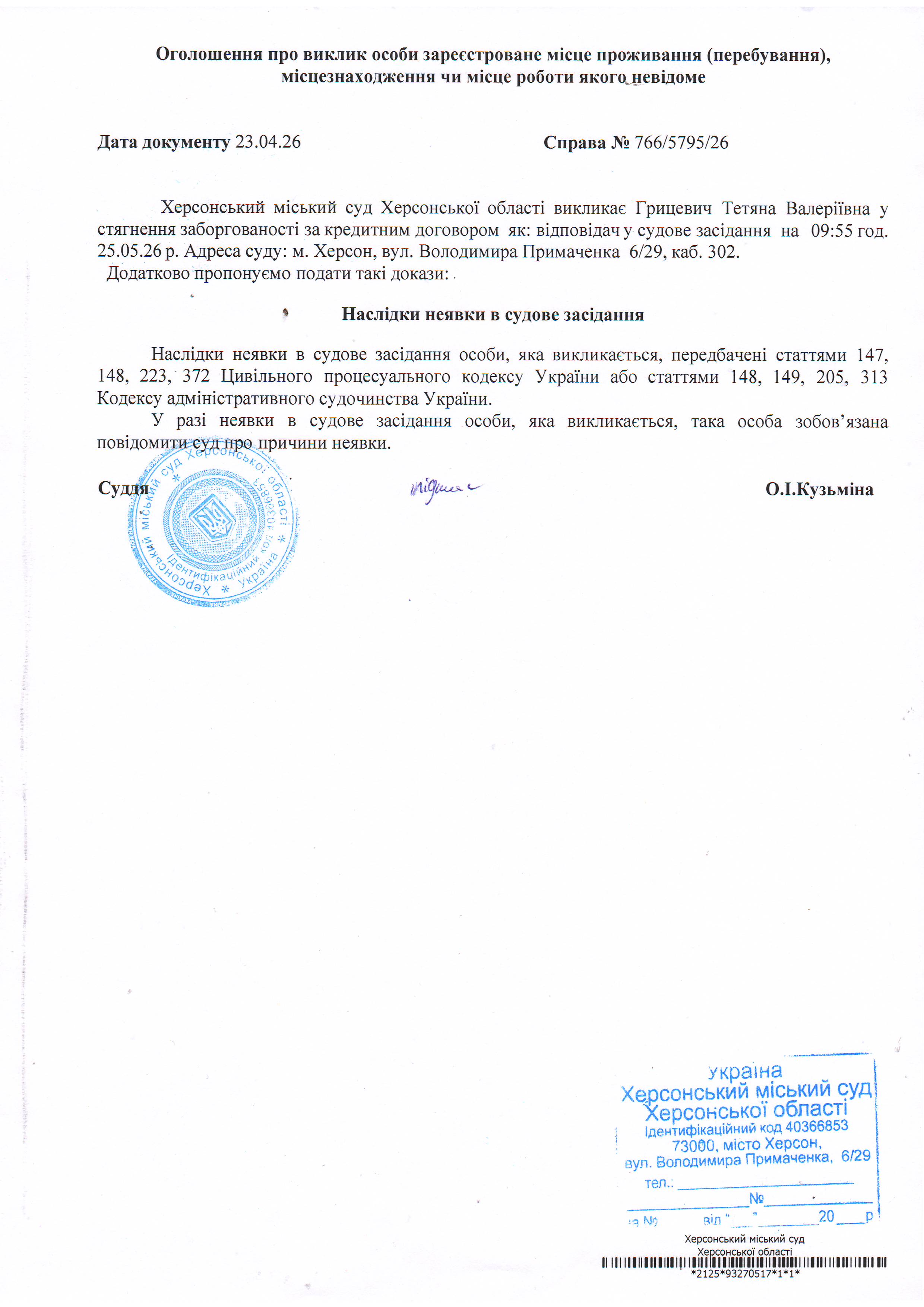 ОГОЛОШЕННЯ ПРО ВИКЛИК ДО СУДУ