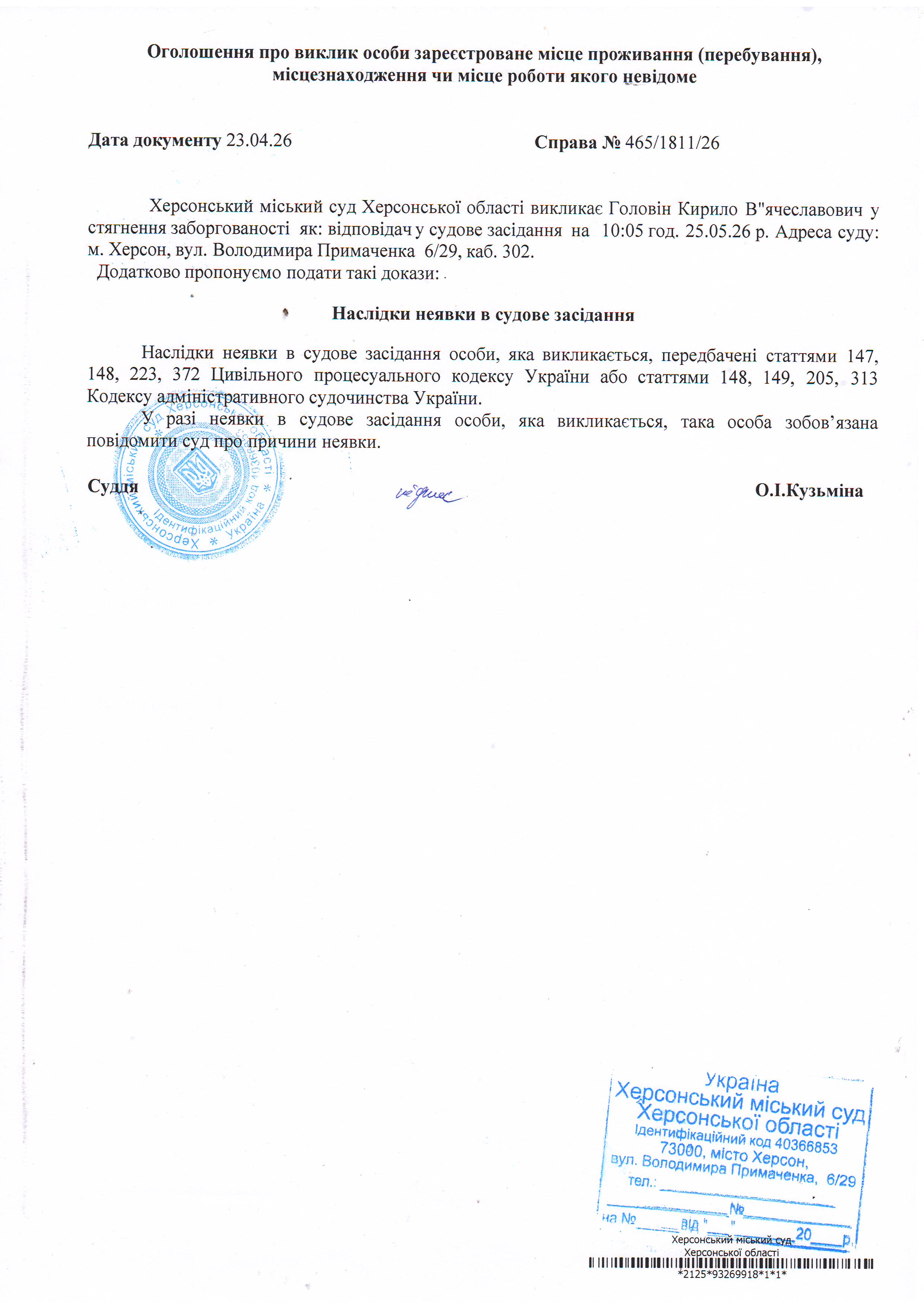 ОГОЛОШЕННЯ ПРО ВИКЛИК ДО СУДУ