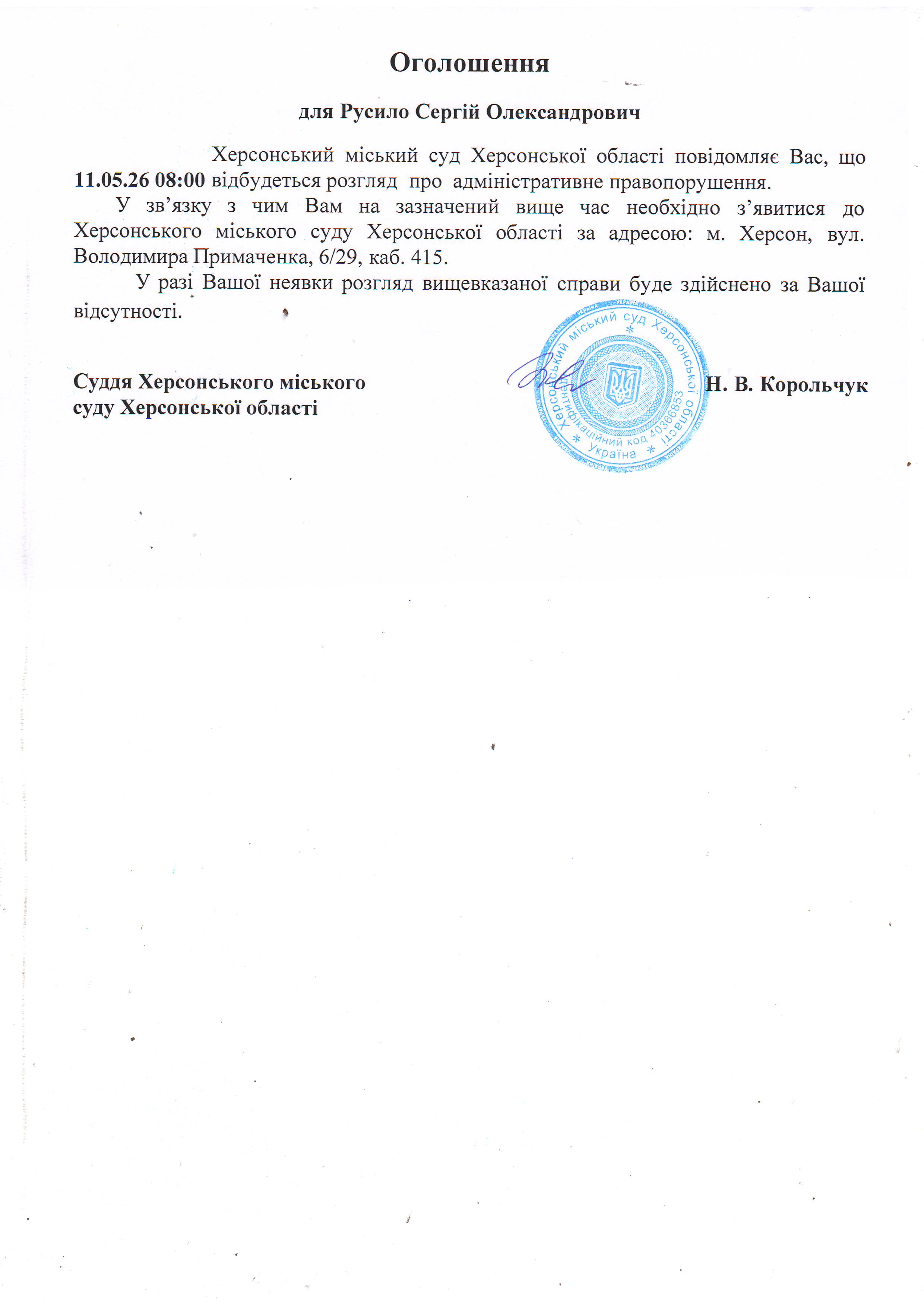 Оголошення для Русила Сергія Олександровича