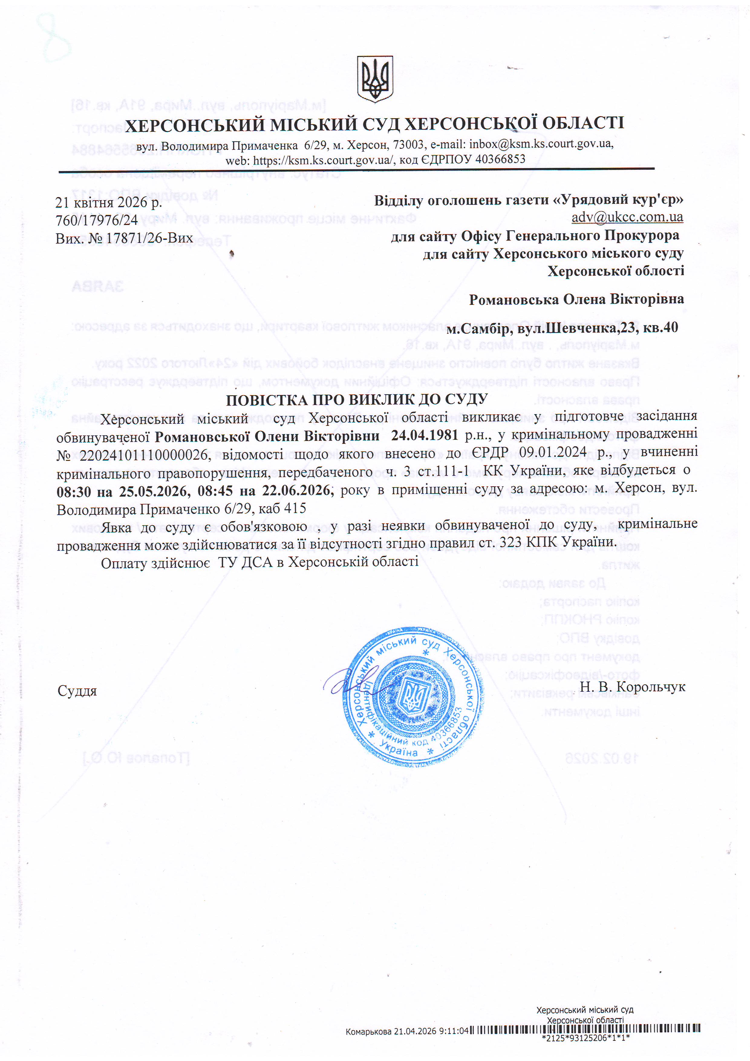 ОГОЛОШЕННЯ ПРО ВИКЛИК ДО СУДУ
