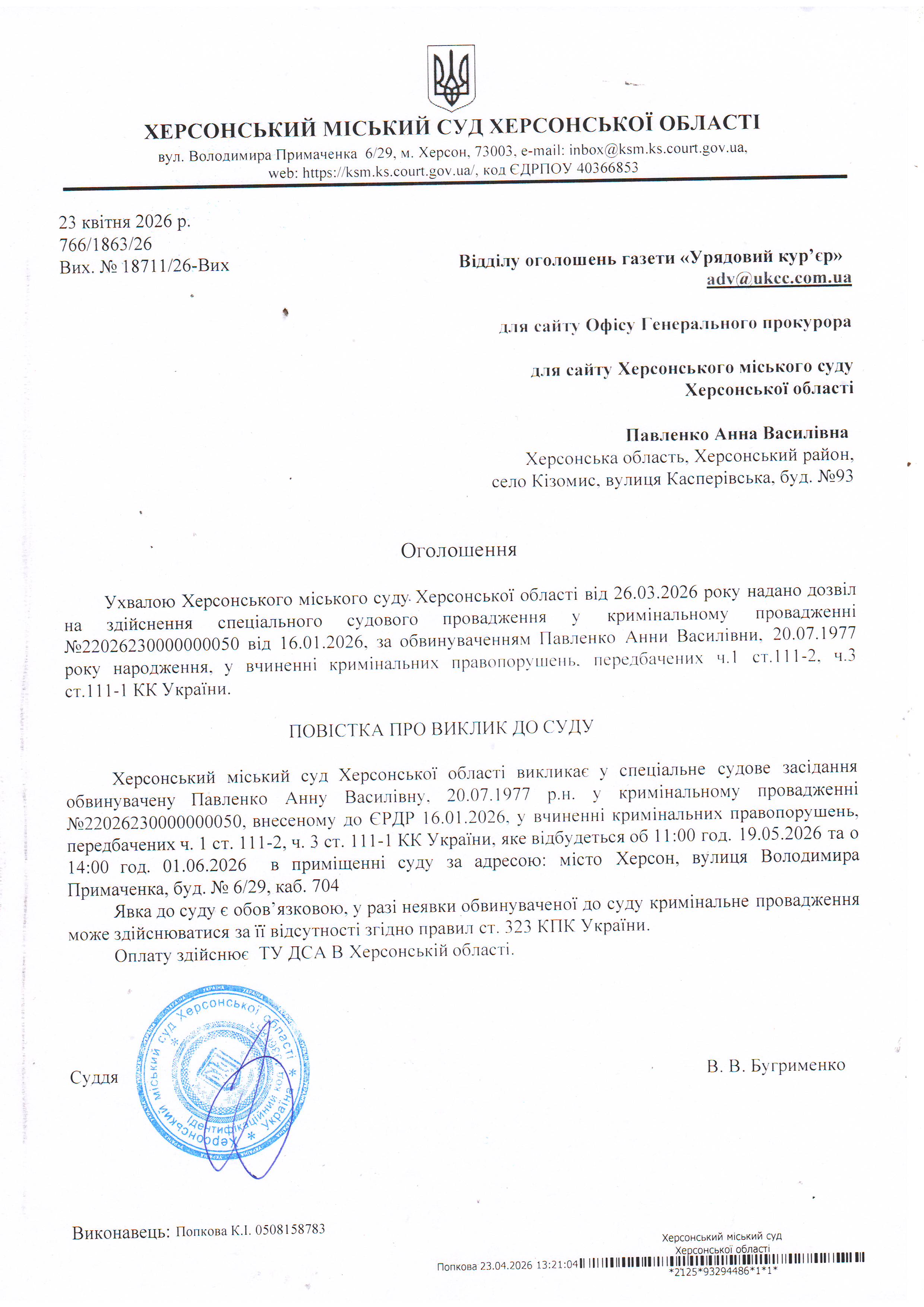 Оголошення про виклик особи в суд та повідомлення про судове рішення