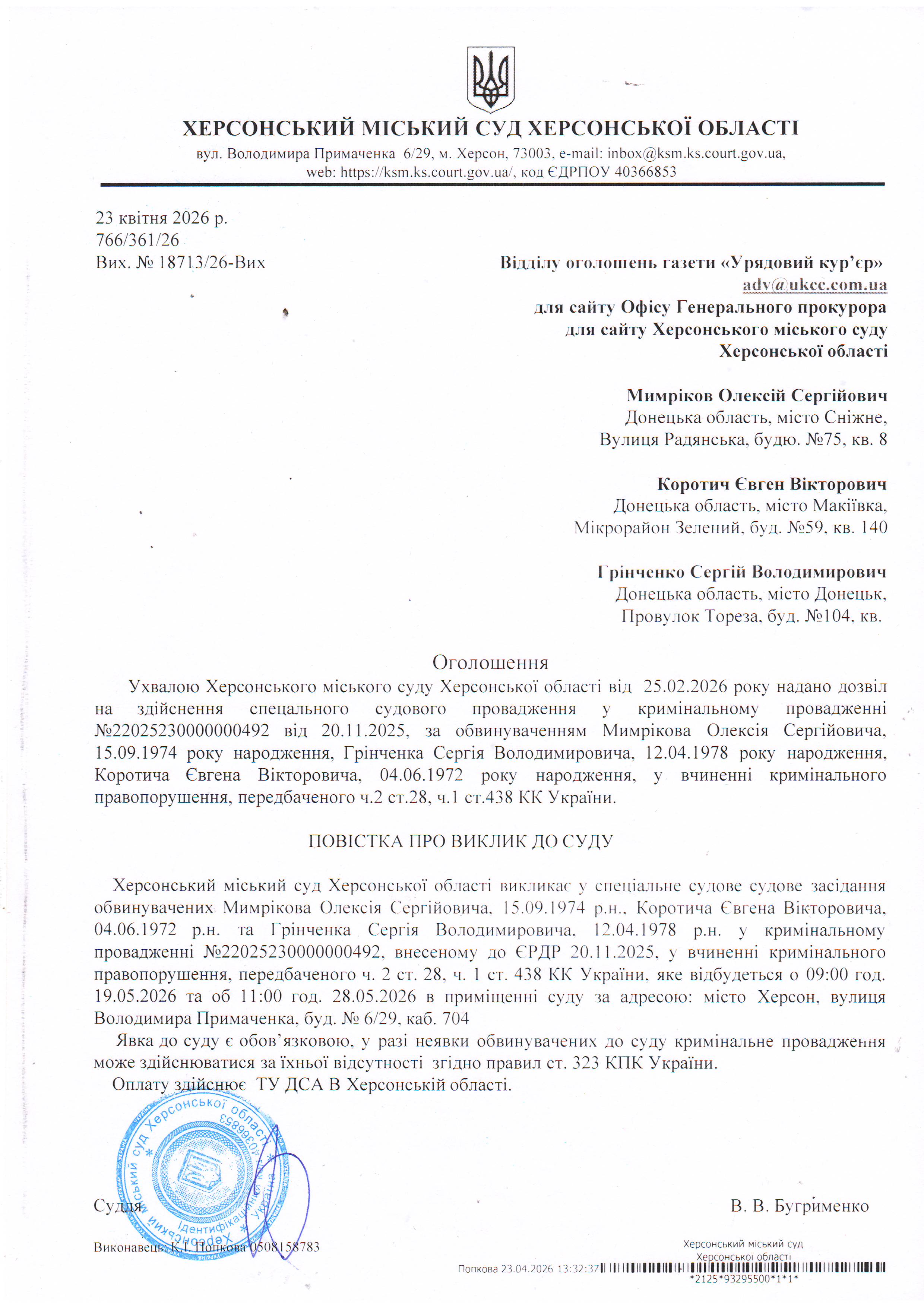 Оголошення для Мимрікова Олексія Сергійовича, Коротич Євгена Вікторовича, Грінченка Сергія Володимировича