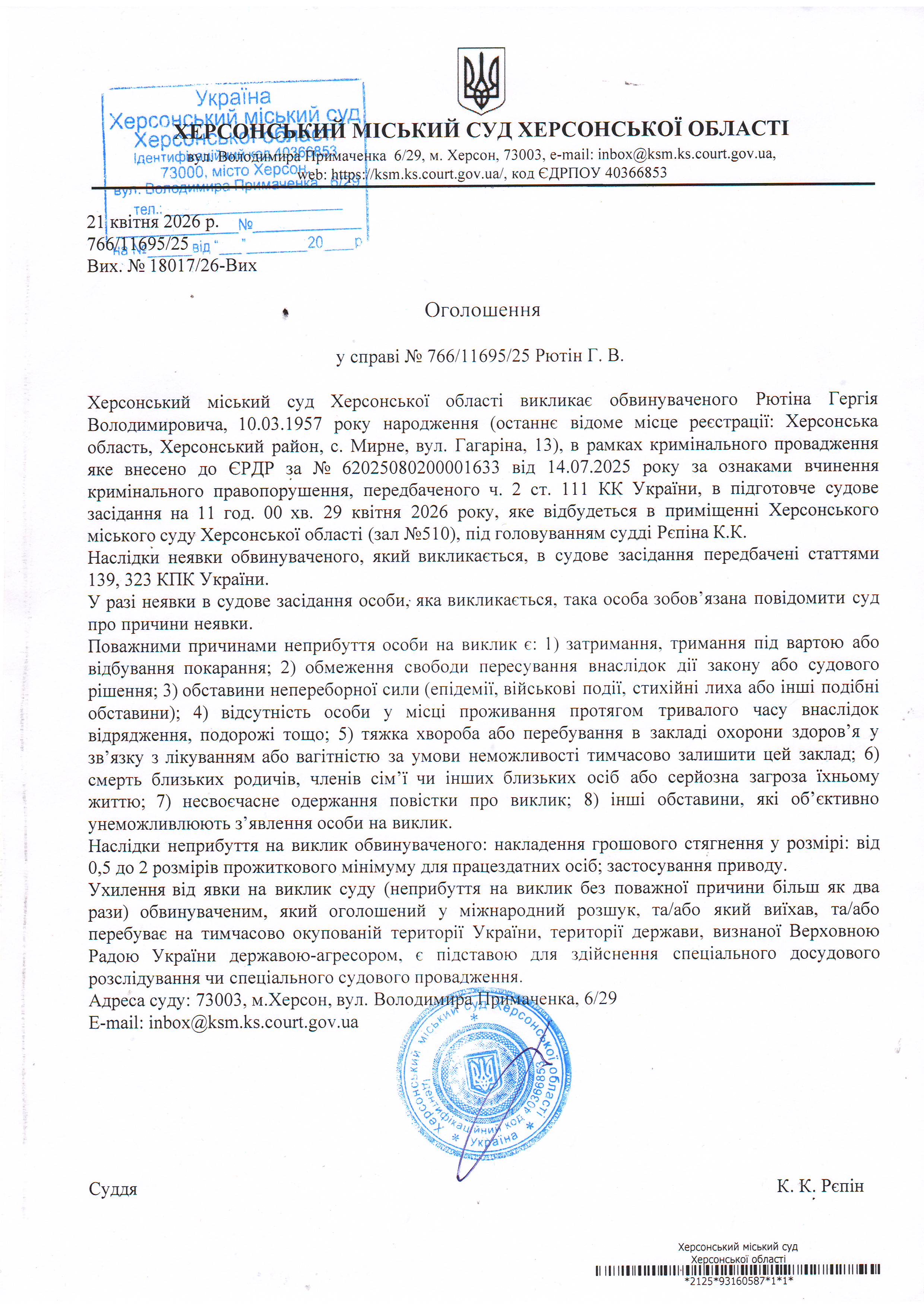 Оголошення про виклик особи в суд та повідомлення про судове рішення