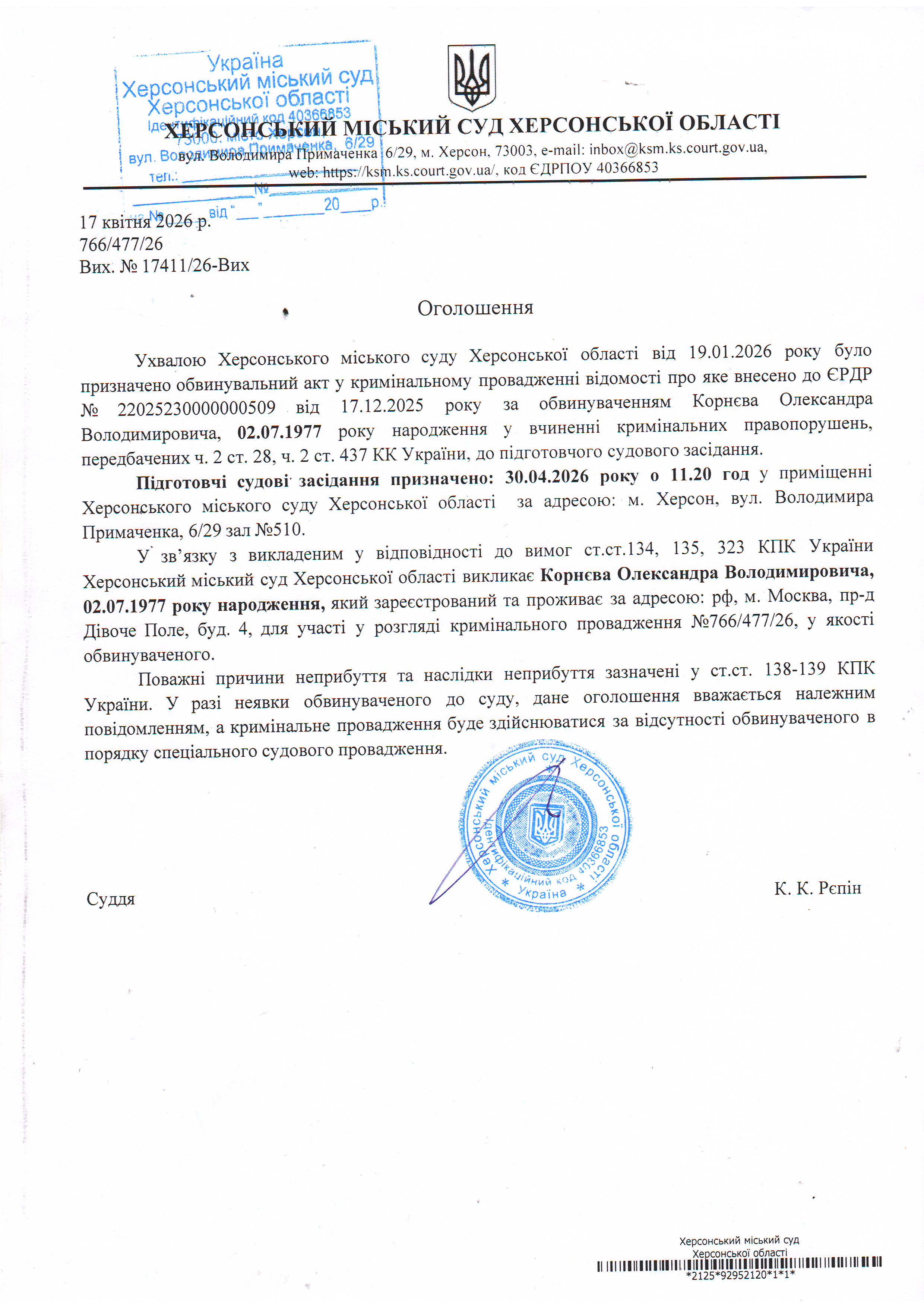 ОГОЛОШЕННЯ ПРО ВИКЛИК ДО СУДУ