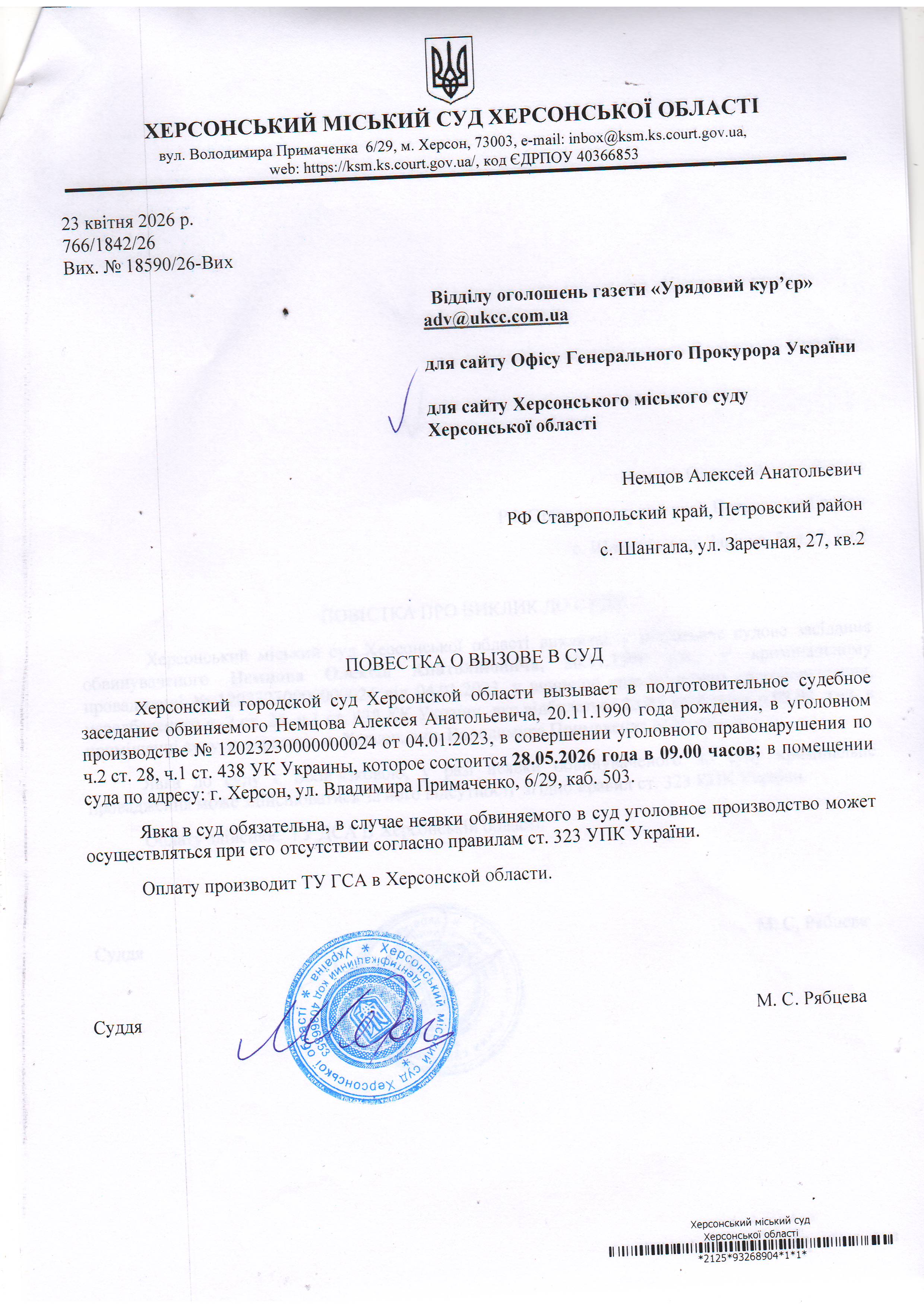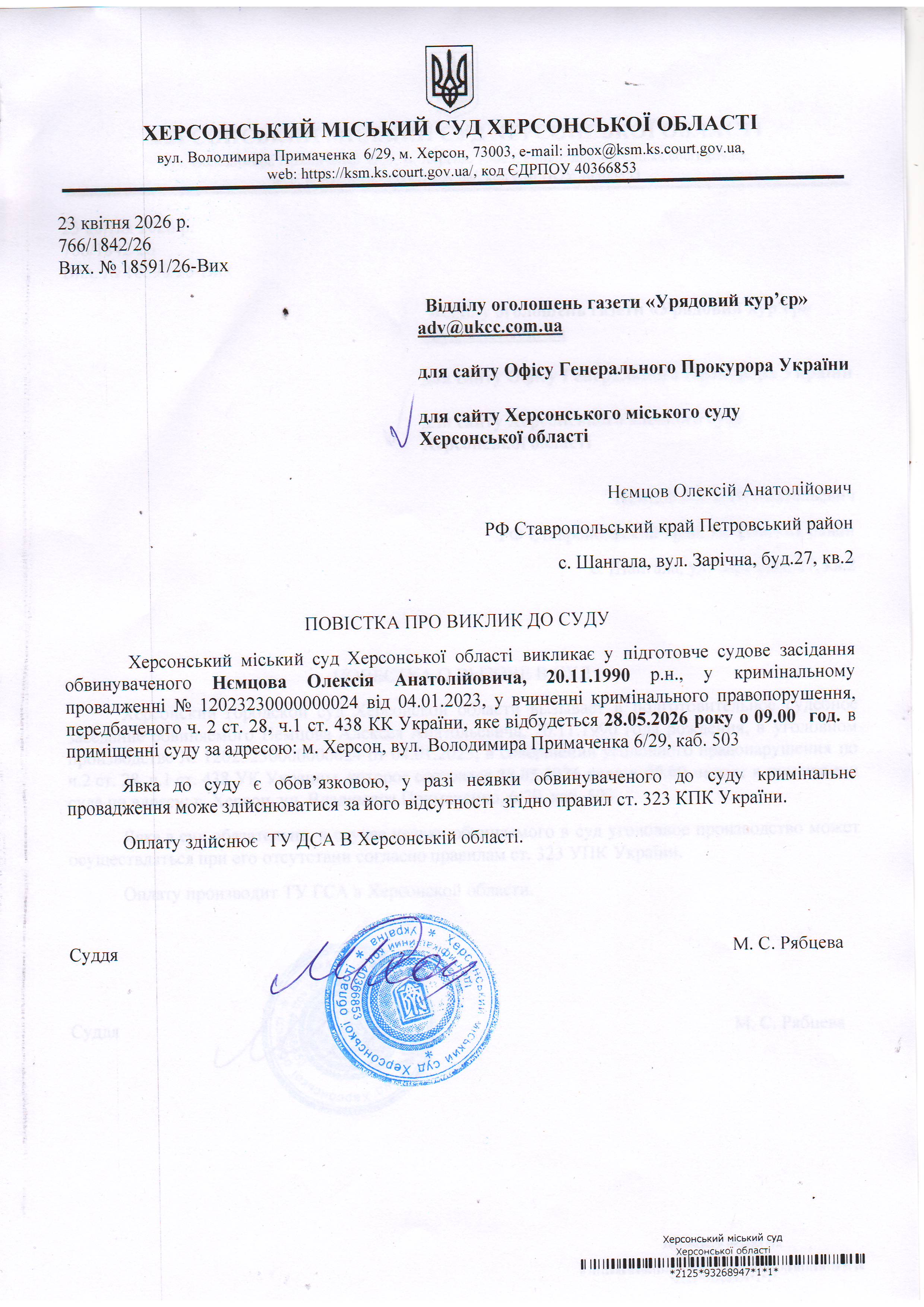 ОГОЛОШЕННЯ ПРО ВИКЛИК ДО СУДУ