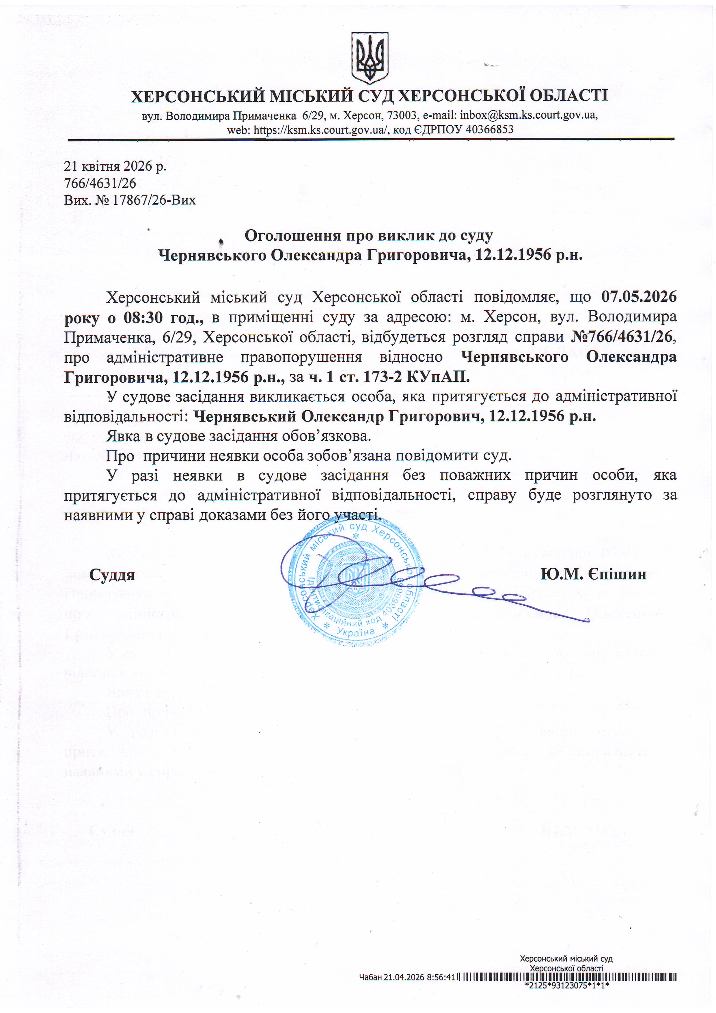 ОГОЛОШЕННЯ ПРО ВИКЛИК ДО СУДУ