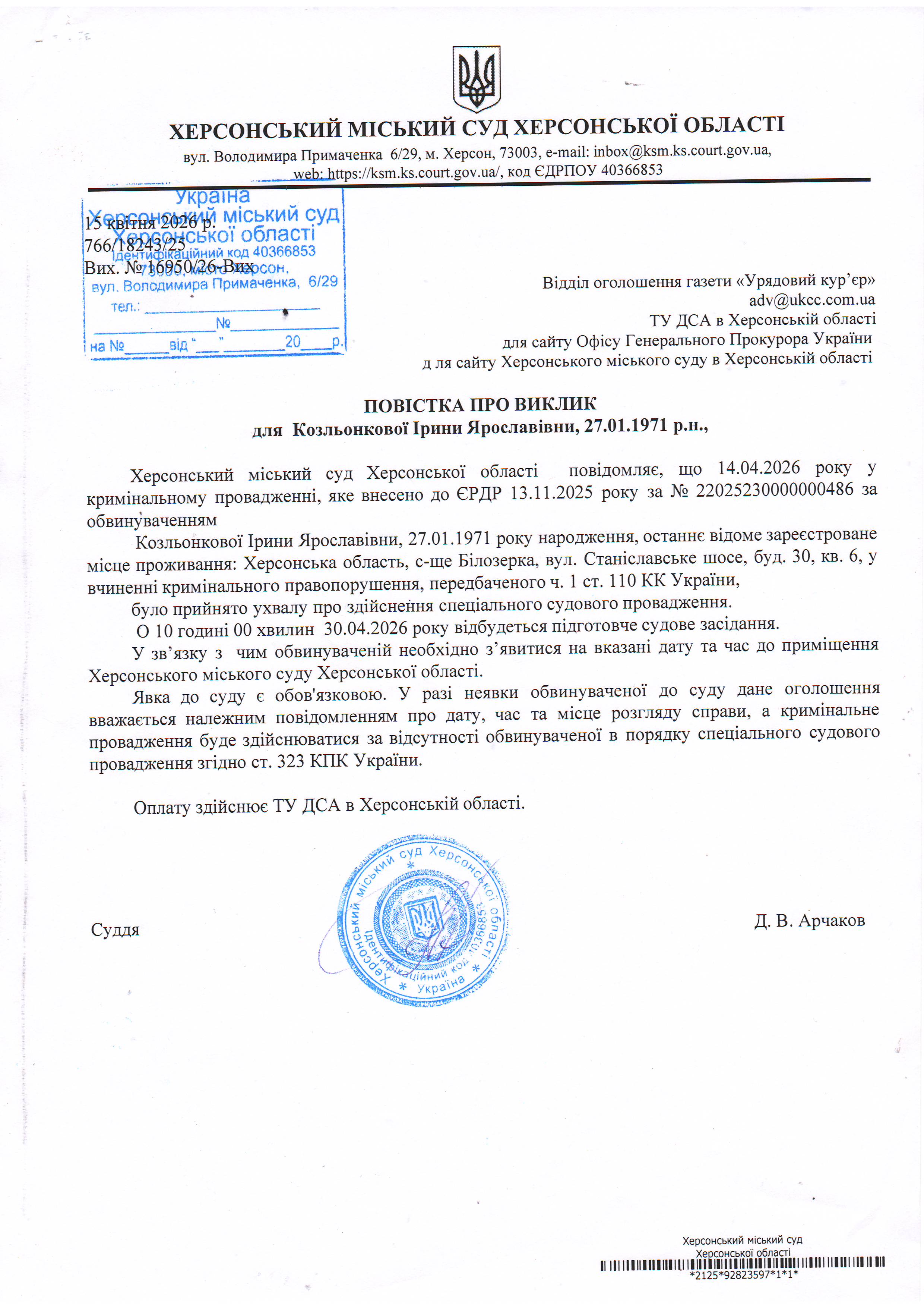 ОГОЛОШЕННЯ ПРО ВИКЛИК ДО СУДУ