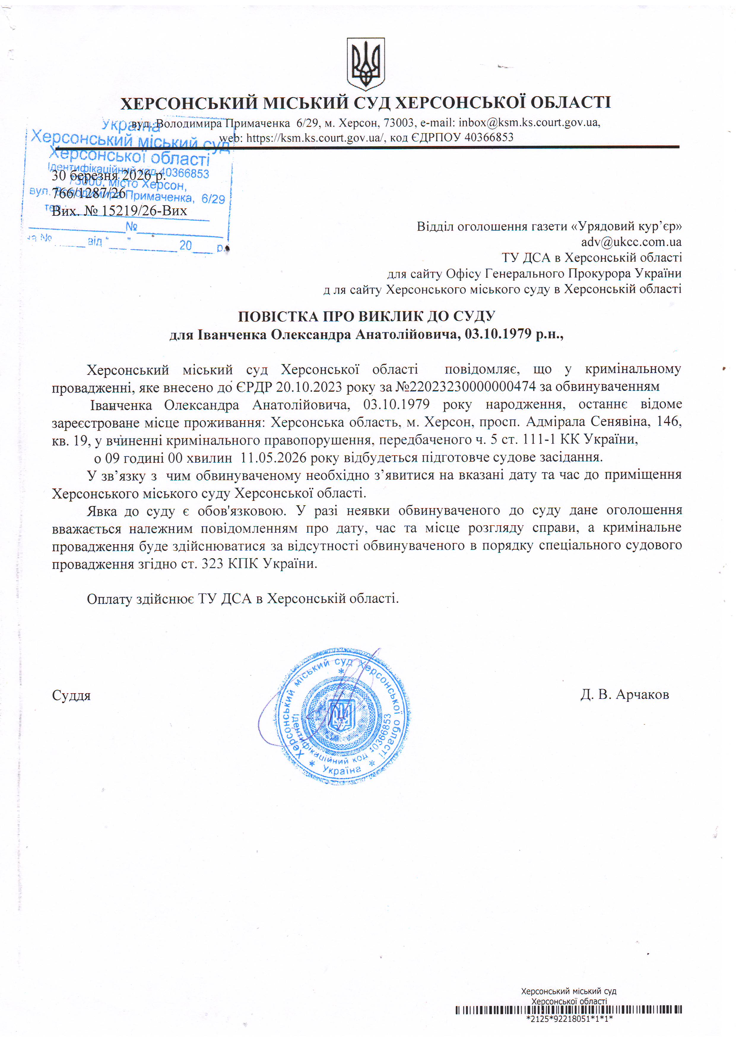 ОГОЛОШЕННЯ ПРО ВИКЛИК ДО СУДУ