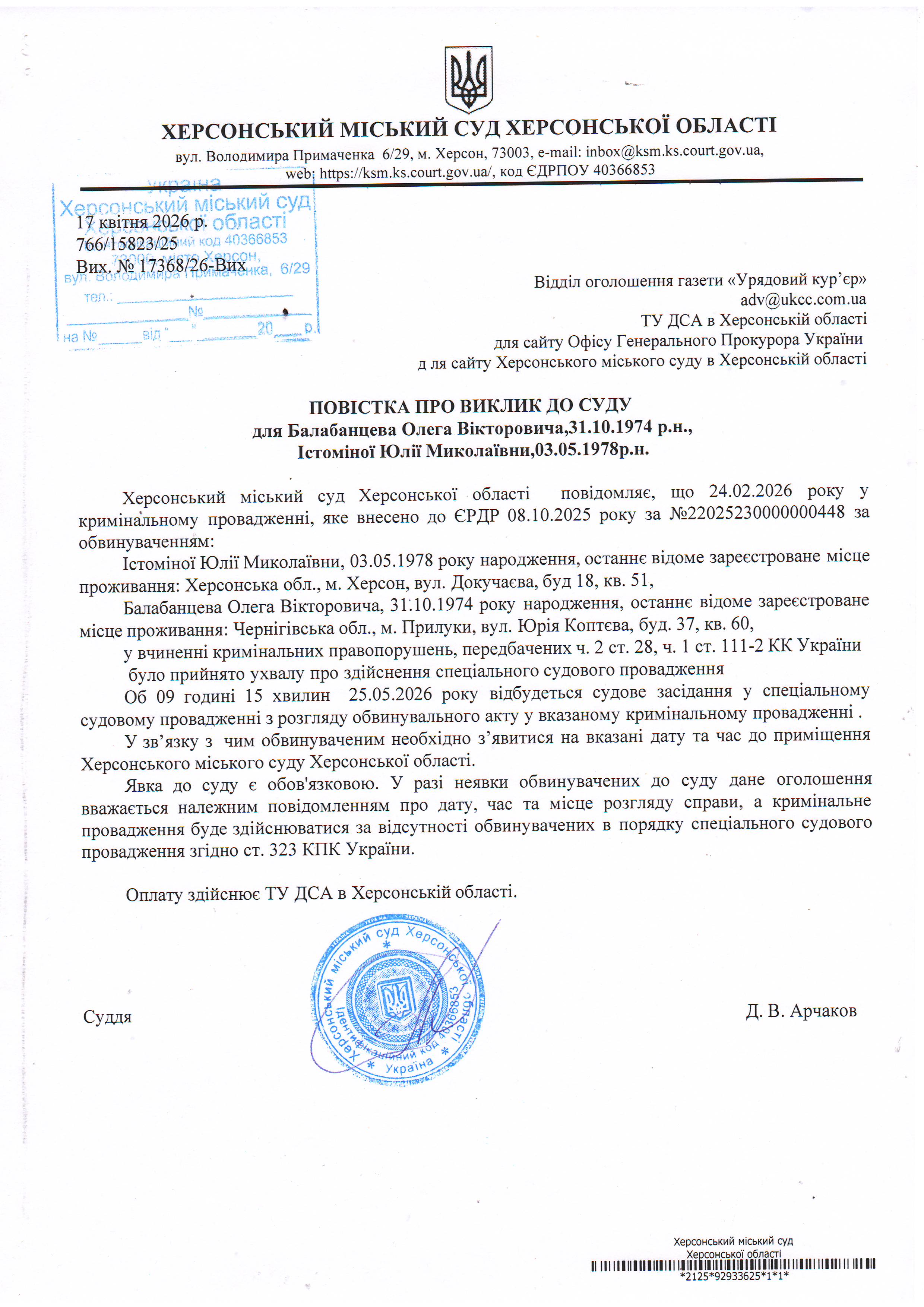 Оголошення для Балабанцева Олега Вікторвича, Істоміної Юлії Миколаївни