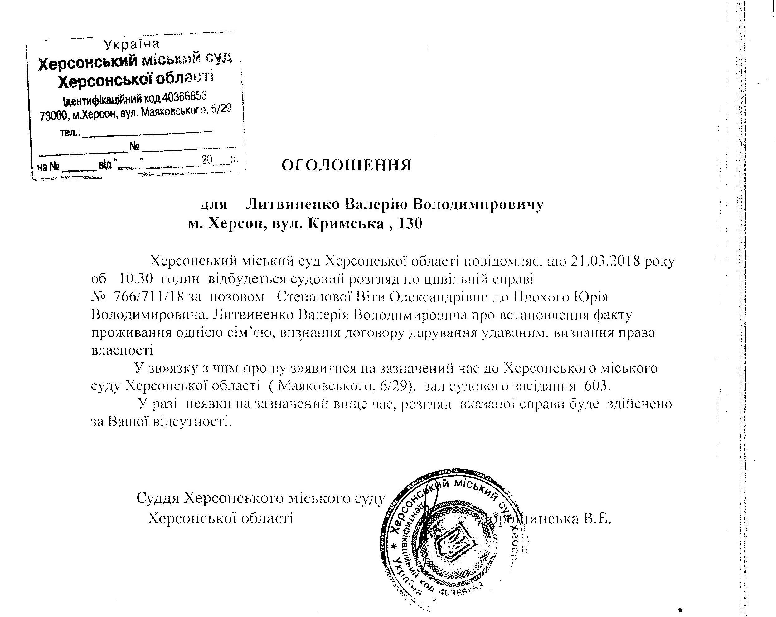 ОГОЛОШЕННЯ для Литвиненко Валерія Володимировича