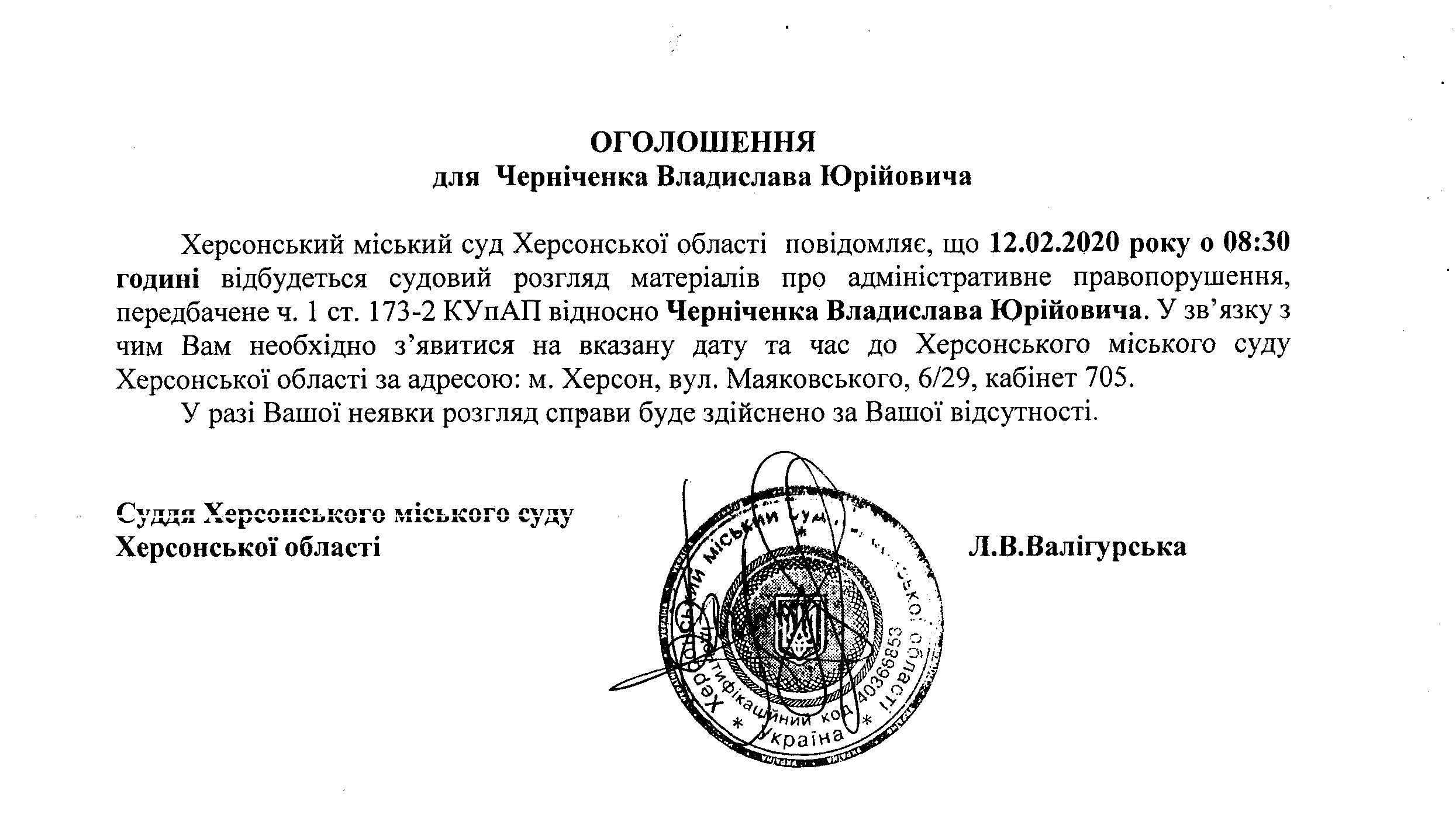 ОГОЛОШЕННЯ для Черніченка Владислава Юрійовича