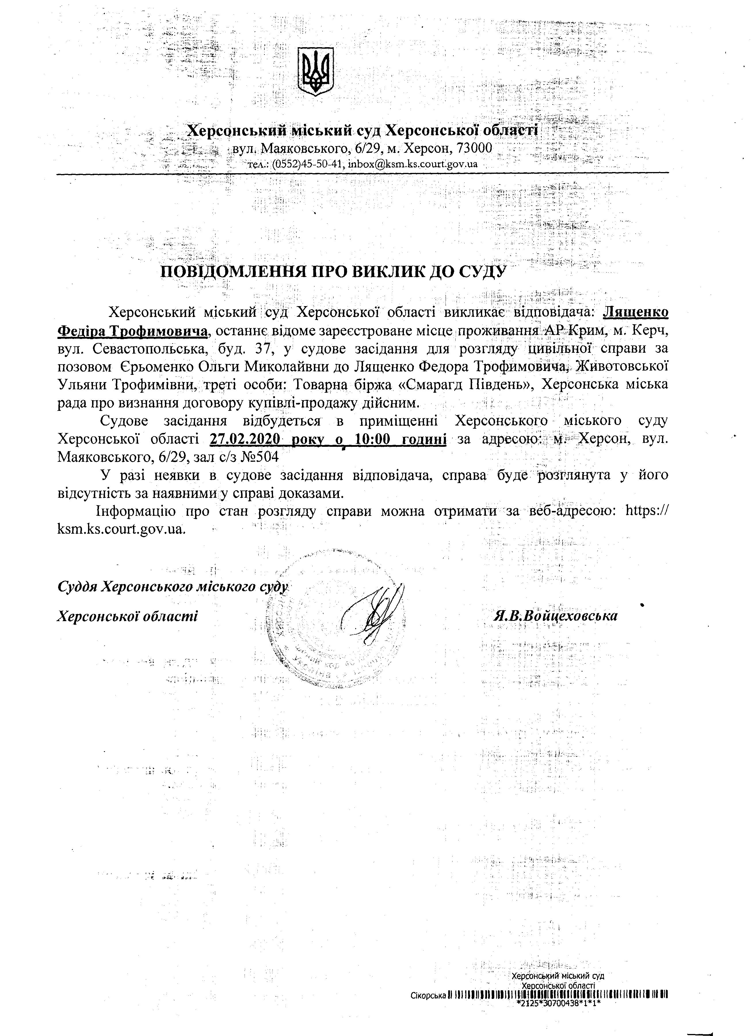 ОГОЛОШЕННЯ для Лященко Федіра Трофимовича