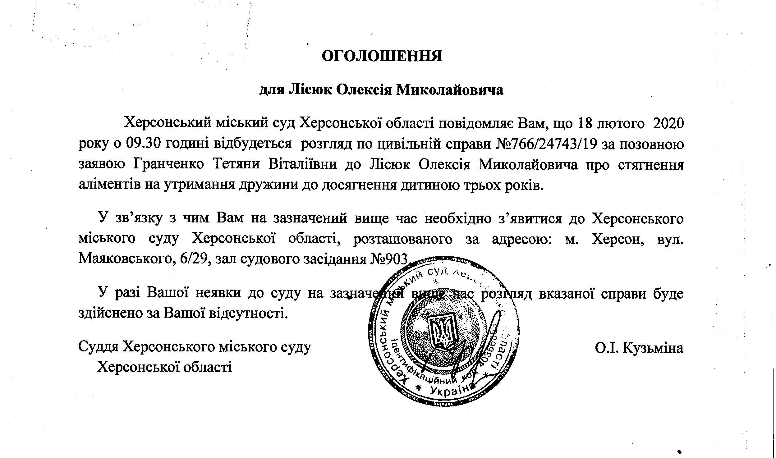 ОГОЛОШЕННЯ для Лісюк Олексія Миколайовича