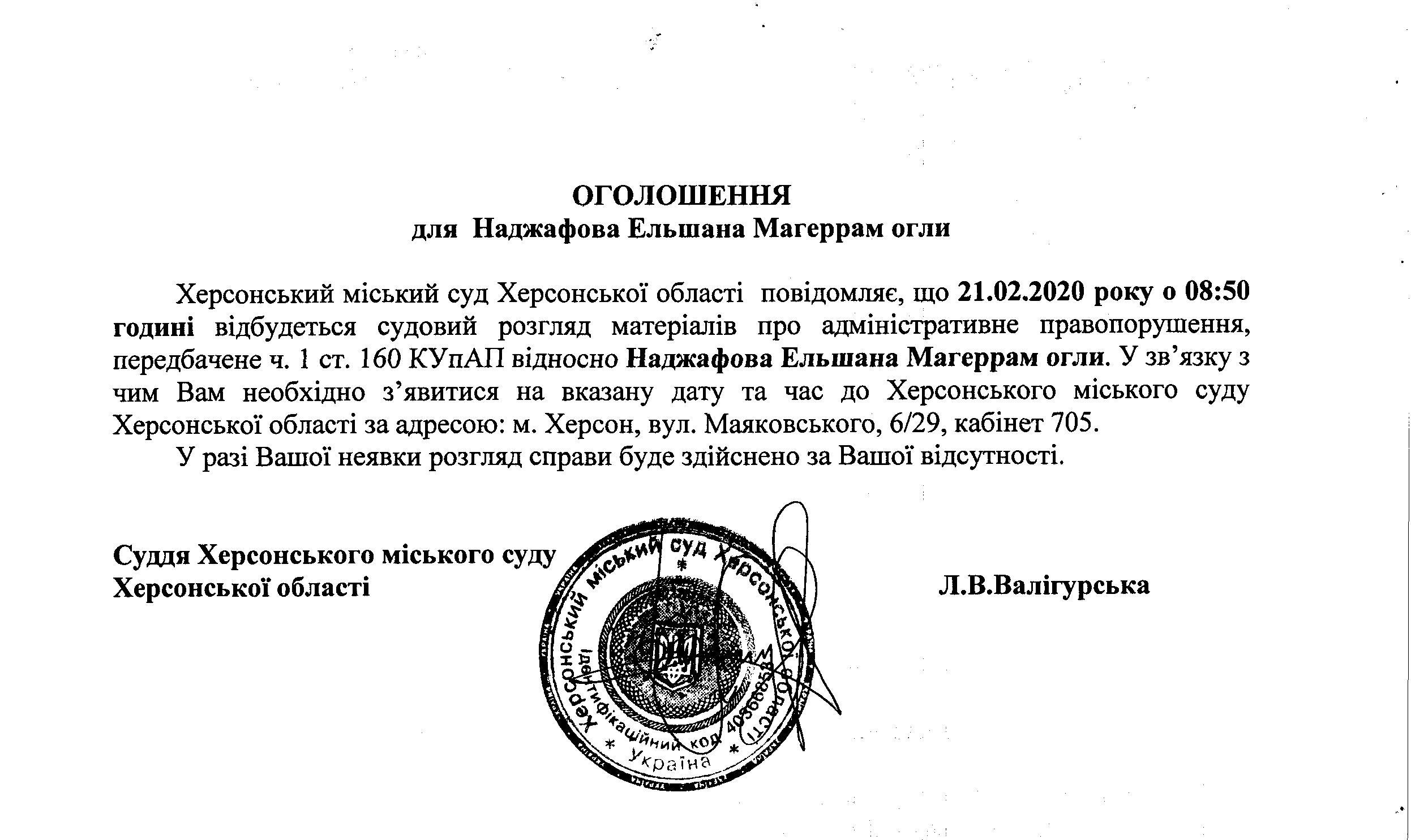 ОГОЛОШЕННЯ для Наджафарова Ельшана Магеррам огли